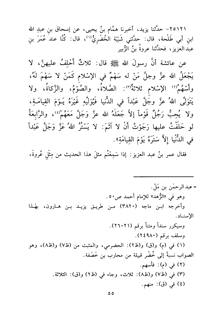 ٢٥١٢١ - حَدَّثَنَا يَزِيدُ، أَخْبَرَنَا هَمَّامُ بْنُ يَحْيَى، عَنْ إِسْحَاقَ بْنِ عَبْدِ اللهِ بْنِ أَبِي طَلْحَةَ، قَالَ: حَدَّثَنِي شَيْبَةُ الْخُضَرِيُّ، (١) قَالَ: كُنَّا عِنْدَ عُمَرَ بْنِ عَبْدِ الْعَزِيزِ، فَحَدَّثَنَا عُرْوَةُ بْنُ الزُّبَيْرِ، عَنْ عَائِشَةَ، أَنَّ رَسُولَ اللهِ صَلَّى اللهُ عَلَيْهِ وَسَلَّمَ قَالَ: " ثَلَاثٌ أَحْلِفُ عَلَيْهِنَّ، لَا يَجْعَلُ اللهُ عَزَّ وَجَلَّ مَنْ لَهُ سَهْمٌ فِي الْإِسْلَامِ كَمَنْ لَا سَهْمَ لَهُ، وَأَسْهُمُ (٢) الْإِسْلَامِ ثَلَاثَةٌ: (٣) الصَّلَاةُ، وَالصَّوْمُ، وَالزَّكَاةُ، وَلَا يَتَوَلَّى الله عَزَّ وَجَلَّ عَبْدًا فِي الدُّنْيَا فَيُوَلِّيهِ غَيْرَهُ يَوْمَ الْقِيَامَةِ، وَلَا يُحِبُّ رَجُلٌ قَوْمًا إِلَّا جَعَلَهُ اللهُ عَزَّ وَجَلَّ مَعَهُمْ، (٤) وَالرَّابِعَةُ لَوْ حَلَفْتُ عَلَيْهَا رَجَوْتُ أَنْ لَا آثَمَ: لَا يَسْتُرُ اللهُ عَزَّ وَجَلَّ عَبْدًا فِي الدُّنْيَا إِلَّا سَتَرَهُ يَوْمَ الْقِيَامَةِ " فَقَالَ عُمَرُ بْنُ عَبْدِ الْعَزِيزِ: إِذَا سَمِعْتُمْ مِثْلَ هَذَا الْحَدِيثِ مِنْ مِثْلِ عُرْوَةَ