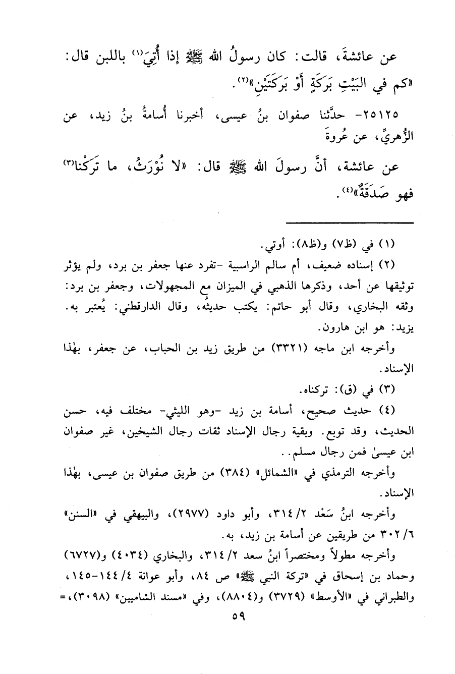 ٢٥١٢٥ - حَدَّثَنَا صَفْوَانُ بْنُ عِيسَى، أَخْبَرَنَا أُسَامَةُ بْنُ زَيْدٍ، عَنِ الزُّهْرِيِّ، عَنْ عُرْوَةَ، عَنْ عَائِشَةَ، أَنَّ رَسُولَ اللهِ صَلَّى اللهُ عَلَيْهِ وَسَلَّمَ قَالَ: " لَا نُورَثُ مَا تَرَكْنَا (٣) فَهُوَ صَدَقَةٌ " (٤)