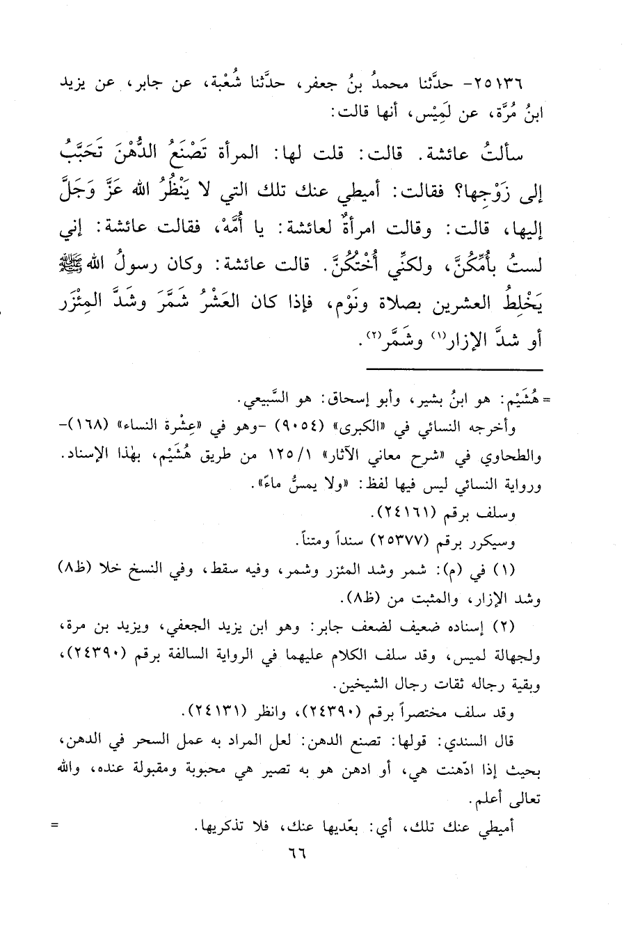 ٢٥١٣٦ - حَدَّثَنَا مُحَمَّدُ بْنُ جَعْفَرٍ، حَدَّثَنَا شُعْبَةُ، عَنْ جَابِرٍ، عَنْ يَزِيدَ بْنِ مُرَّةَ، عَنْ لَمِيسَ، أَنَّهَا قَالَتْ: سَأَلْتُ عَائِشَةَ، قَالَتْ: قُلْتُ لَهَا: الْمَرْأَةُ تَصْنَعُ الدُّهْنَ تَحَبَّبُ إِلَى زَوْجِهَا؟ فَقَالَتْ: " أَمِيطِي عَنْكِ تِلْكَ الَّتِي لَا يَنْظُرُ اللهُ عَزَّ وَجَلَّ إِلَيْهَا "