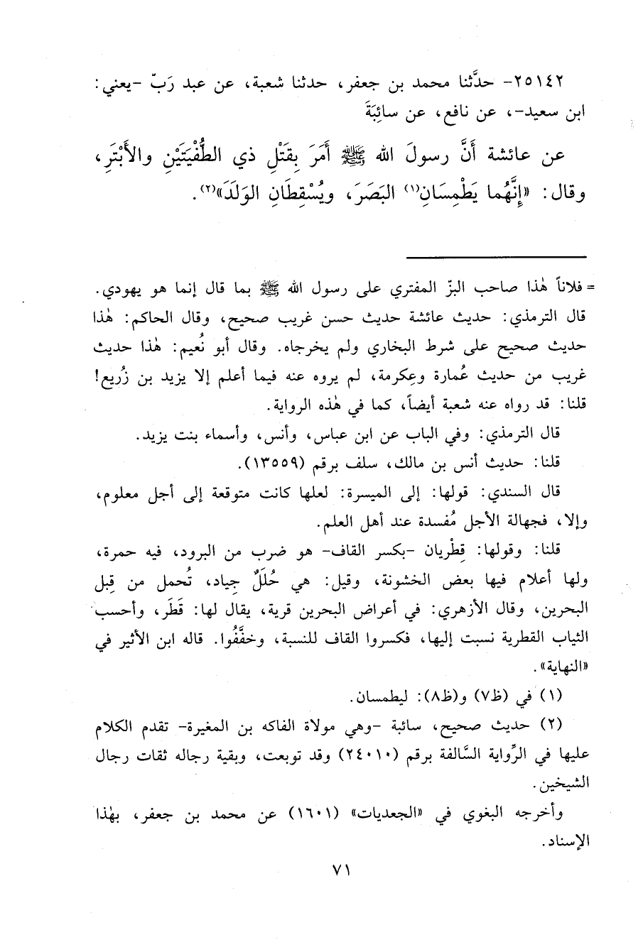 ٢٥١٤٢ - حَدَّثَنَا مُحَمَّدُ بنُ جَعْفَرٍ، حَدَّثَنَا شُعْبَةُ، عَنْ عَبْدِ رَبٍّ يَعْنِي ابْنَ سَعِيدٍ، عَنْ نَافِعٍ، عَنْ سَائِبَةَ، عَنْ عَائِشَةَ، أَنَّ رَسُولَ اللهِ صَلَّى اللهُ عَلَيْهِ وَسَلَّمَ أَمَرَ بِقَتْلِ ذِي الطُّفْيَتَيْنِ وَالْأَبْتَرِ، وَقَالَ: " إِنَّهُمَا يَطْمِسَانِ (١) الْبَصَرَ، وَيُسْقِطَانِ الْوَلَدَ " (٢)