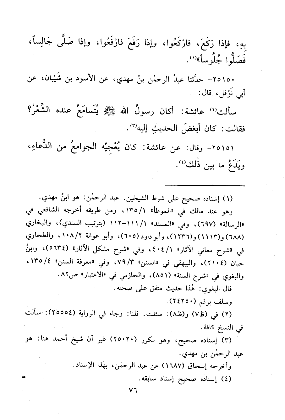 ٢٥١٥٠ - حَدَّثَنَا عَبْدُ الرَّحْمَنِ بْنُ مَهْدِيٍّ، عَنِ الْأَسْوَدِ بْنِ شَيْبَانَ، عَنْ أَبِي نَوْفَلٍ، قَالَ: سَأَلْتُ (٢) عَائِشَةَ أَكَانَ رَسُولُ اللهِ صَلَّى اللهُ عَلَيْهِ وَسَلَّمَ يُتَسَامَعُ عِنْدَهُ الشِّعْرُ؟ فَقَالَتْ: " كَانَ أَبْغَضَ الْحَدِيثِ إِلَيْهِ " (٣)
