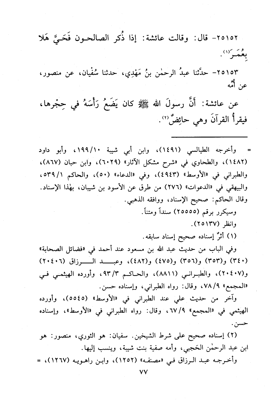 ٢٥١٥٣ - حَدَّثَنَا عَبْدُ الرَّحْمَنِ بْنُ مَهْدِيٍّ، حَدَّثَنَا سُفْيَانُ، عَنْ مَنْصُورٍ، عَنْ أُمِّهِ، عَنْ عَائِشَةَ: " أَنَّ رَسُولَ اللهِ صَلَّى اللهُ عَلَيْهِ وَسَلَّمَ كَانَ يَضَعُ رَأْسَهُ فِي حِجْرِهَا، فَيَقْرَأُ الْقُرْآنَ وَهِيَ حَائِضٌ " (٢)