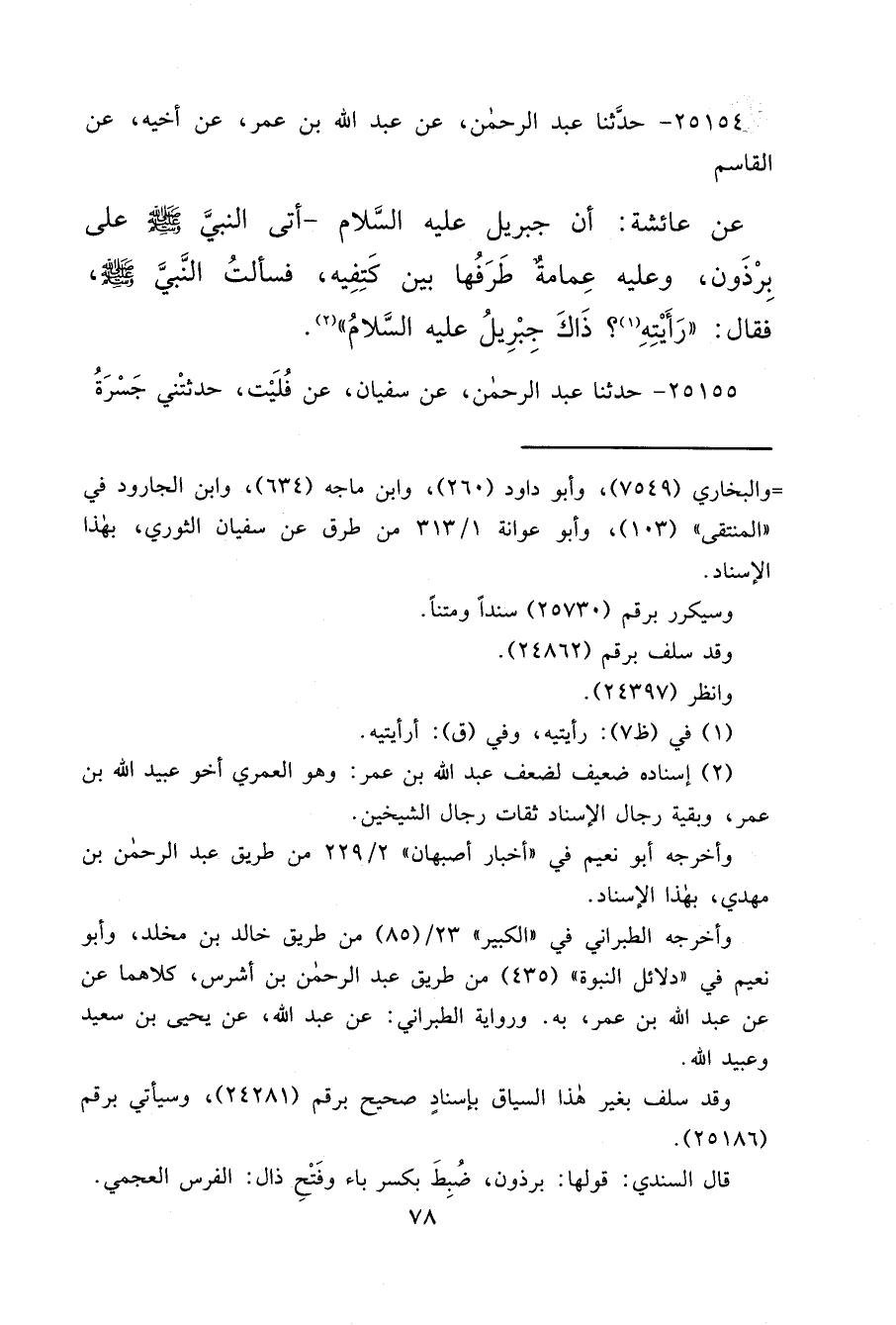 ٢٥١٥٤ - حَدَّثَنَا عَبْدُ الرَّحْمَنِ، عَنْ عَبْدِ اللهِ بْنِ عُمَرَ، عَنْ أَخِيهِ، عَنِ الْقَاسِمِ، عَنْ عَائِشَةَ: أَنَّ جِبْرِيلَ عَلَيْهِ السَّلَامُ أَتَى النَّبِيَّ صَلَّى اللهُ عَلَيْهِ وَسَلَّمَ عَلَى بِرْذَوْنٍ، وَعَلَيْهِ عِمَامَةٌ طَرَفُهَا بَيْنَ كَتِفَيْهِ، فَسَأَلْتُ النَّبِيَّ صَلَّى اللهُ عَلَيْهِ وَسَلَّمَ، فَقَالَ: " رَأَيْتِيهِ (١) ؟ ذَاكَ جِبْرِيلُ عَلَيْهِ السَّلَامُ " (٢)