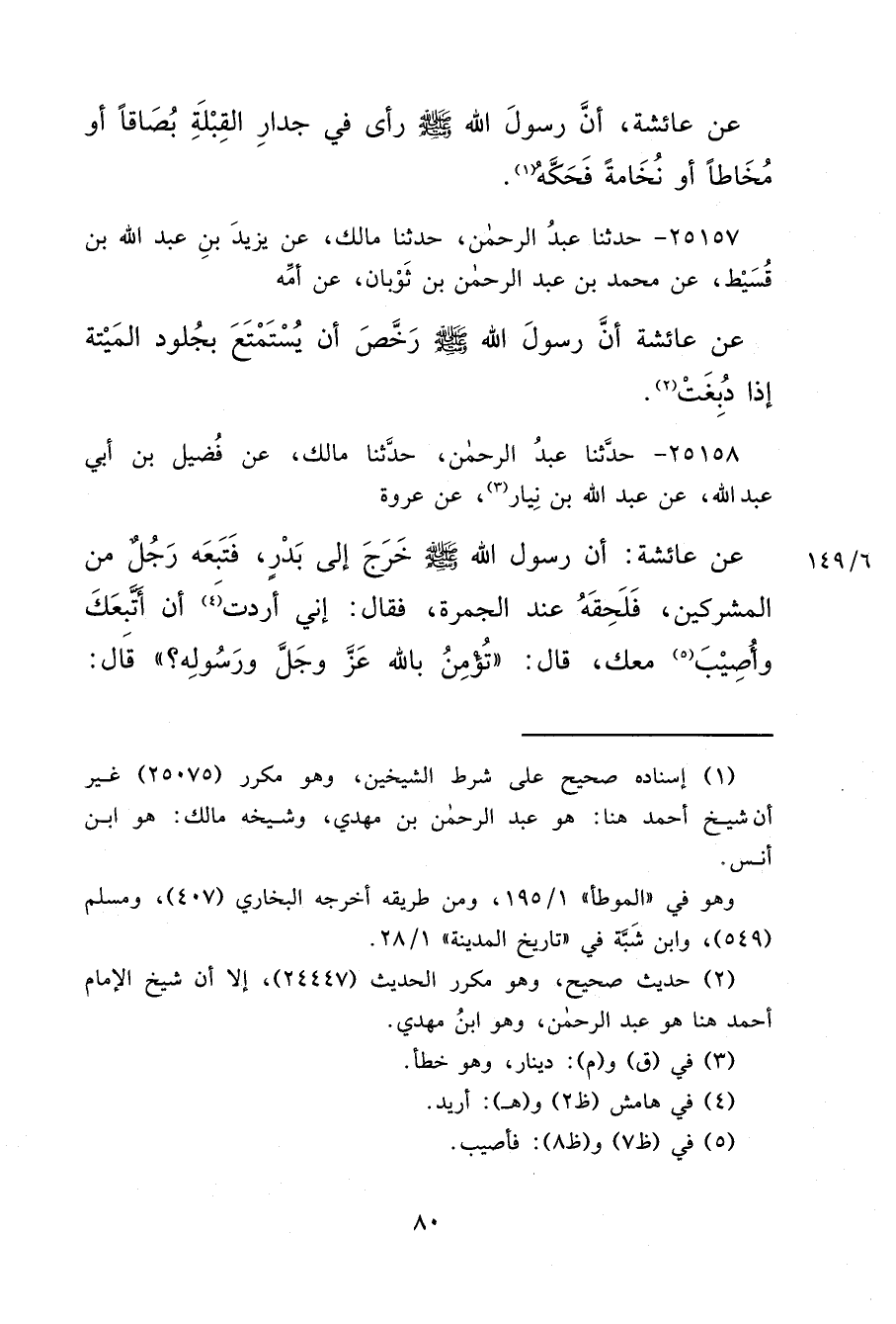 ٢٥١٥٨ - حَدَّثَنَا عَبْدُ الرَّحْمَنِ، حَدَّثَنَا مَالِكٌ، عَنْ فُضَيْلِ بْنِ أَبِي عَبْدِ اللهِ، عَنْ عَبْدِ اللهِ بْنِ نِيارٍ، (٣) عَنْ عُرْوَةَ، عَنْ عَائِشَةَ: أَنَّ رَسُولَ اللهِ صَلَّى اللهُ عَلَيْهِ وَسَلَّمَ خَرَجَ إِلَى بَدْرٍ، فَتَبِعَهُ رَجُلٌ مِنَ الْمُشْرِكِينَ، فَلَحِقَهُ عِنْدَ الْجَمْرَةِ، فَقَالَ: إِنِّي أَرَدْتُ (٤) أَنْ أَتْبَعَكَ وَأُصِيبَ (٥) مَعَكَ، قَالَ: " تُؤْمِنُ بِاللهِ عَزَّ وَجَلَّ وَرَسُولِهِ؟ " قَالَ:
