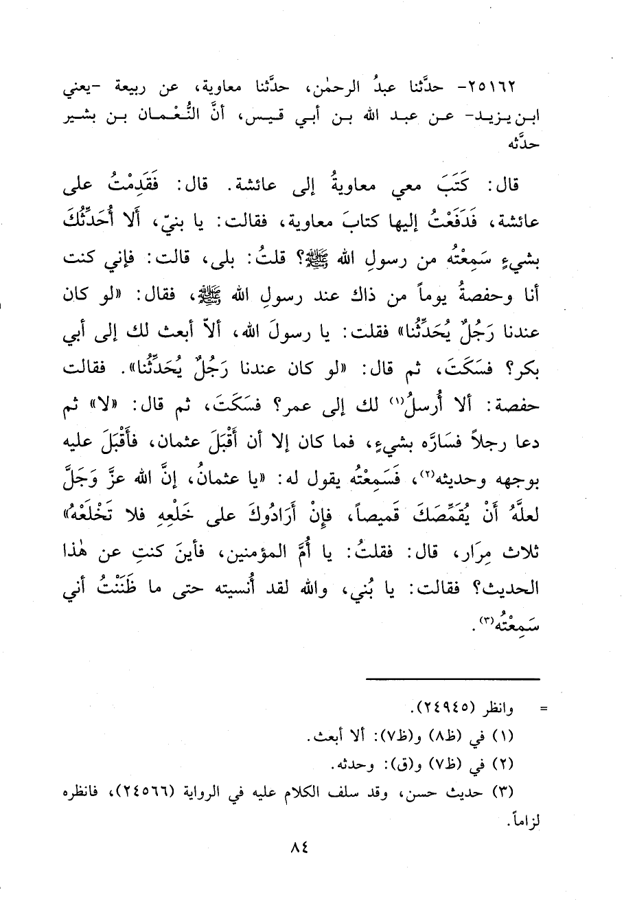 ٢٥١٦٢ - حَدَّثَنَا عَبْدُ الرَّحْمَنِ، حَدَّثَنَا مُعَاوِيَةُ، عَنْ رَبِيعَةَ يَعْنِي ابْنَ يَزِيدَ، عَنْ عَبْدِ اللهِ بْنِ أَبِي قَيْسٍ، أَنَّ النُّعْمَانَ بْنَ بَشِيرٍ، حَدَّثَهُ قَالَ: كَتَبَ مَعِي مُعَاوِيَةُ إِلَى عَائِشَةَ قَالَ: فَقَدِمْتُ عَلَى عَائِشَةَ، فَدَفَعْتُ إِلَيْهَا كِتَابَ مُعَاوِيَةَ فَقَالَتْ: يَا بُنَيَّ، أَلَا أُحَدِّثُكَ بِشَيْءٍ سَمِعْتُهُ مِنْ رَسُولِ اللهِ صَلَّى اللهُ عَلَيْهِ وَسَلَّمَ؟ قُلْتُ: بَلَى، قَالَتْ: فَإِنِّي كُنْتُ أَنَا وَحَفْصَةُ يَوْمًا مِنْ ذَاكَ عِنْدَ رَسُولِ اللهِ صَلَّى اللهُ عَلَيْهِ وَسَلَّمَ فَقَالَ: " لَوْ كَانَ عِنْدَنَا رَجُلٌ يُحَدِّثُنَا " فَقُلْتُ: يَا رَسُولَ اللهِ، أَلَا أَبْعَثُ لَكَ إِلَى أَبِي بَكْرٍ؟ فَسَكَتَ، ثُمَّ قَالَ: " لَوْ كَانَ عِنْدَنَا رَجُلٌ يُحَدِّثُنَا " فَقَالَتْ حَفْصَةُ: أَلَا أُرْسِلُ (١) لَكَ إِلَى عُمَرَ؟ فَسَكَتَ، ثُمَّ قَالَ: " لَا " ثُمَّ دَعَا رَجُلًا فَسَارَّهُ بِشَيْءٍ، فَمَا كَانَ إِلَّا أَنْ أَقْبَلَ عُثْمَانُ، فَأَقْبَلَ عَلَيْهِ بِوَجْهِهِ وَحَدِيثِهِ، (٢) فَسَمِعْتُهُ يَقُولُ لَهُ: " يَا عُثْمَانُ، إِنَّ اللهَ عَزَّ وَجَلَّ لَعَلَّهُ أَنْ يُقَمِّصَكَ قَمِيصًا، فَإِنْ أَرَادُوكَ عَلَى خَلْعِهِ فَلَا تَخْلَعْهُ " ثَلَاثَ مِرَارٍ قَالَ: فَقُلْتُ: يَا أُمَّ الْمُؤْمِنِينَ، فَأَيْنَ كُنْتِ عَنْ هَذَا الْحَدِيثِ؟ فَقَالَتْ: يَا بُنَيَّ، وَاللهِ لَقَدْ أُنْسِيتُهُ حَتَّى مَا ظَنَنْتُ أَنِّي سَمِعْتُهُ (٣)