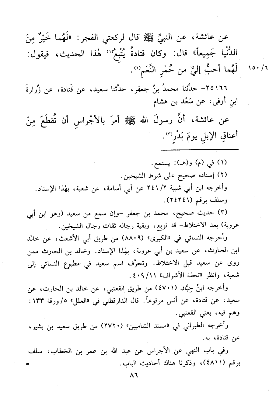 ٢٥١٦٦ - حَدَّثَنَا مُحَمَّدُ بْنُ جَعْفَرٍ، حَدَّثَنَا سَعِيدٌ، عَنْ قَتَادَةَ، عَنْ زُرَارَةَ بْنِ أَوْفَى، عَنْ سَعْدِ بْنِ هِشَامٍ، عَنْ عَائِشَةَ: " أَنَّ رَسُولَ اللهِ صَلَّى اللهُ عَلَيْهِ وَسَلَّمَ أَمَرَ بِالْأَجْرَاسِ أَنْ تُقْطَعَ مِنْ أَعْنَاقِ الْإِبِلِ يَوْمَ بَدْرٍ " (٣)