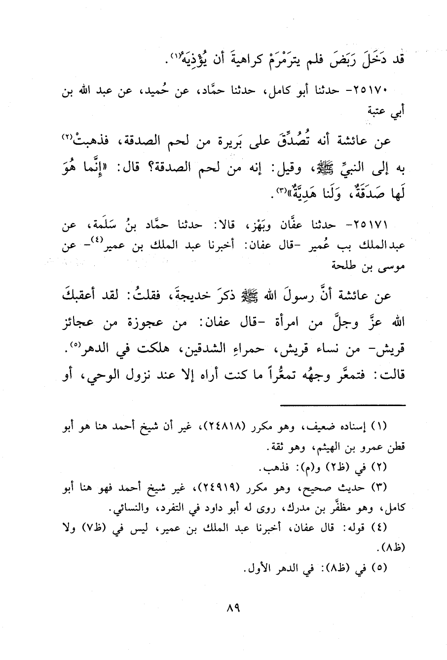 ٢٥١٧١ - حَدَّثَنَا عَفَّانُ، وَبَهْزٌ، قَالَا: حَدَّثَنَا حَمَّادُ بْنُ سَلَمَةَ، عَنْ عَبْدِ الْمَلِكِ بْنِ عُمَيْرٍ - قَالَ عَفَّانُ: أَخْبَرَنَا عَبْدُ الْمَلِكِ بْنُ عُمَيْرٍ (٤) - عَنْ مُوسَى بْنِ طَلْحَةَ، عَنْ عَائِشَةَ، أَنَّ رَسُولَ اللهِ صَلَّى اللهُ عَلَيْهِ وَسَلَّمَ ذَكَرَ خَدِيجَةَ، فَقُلْتُ: لَقَدْ أَعْقَبَكَ اللهُ عَزَّ وَجَلَّ مِنَ امْرَأَةٍ - قَالَ عَفَّانُ: مِنْ عَجُوزَةٍ مِنْ عَجَائِزِ قُرَيْشٍ - مِنْ نِسَاءِ قُرَيْشٍ، حَمْرَاءِ الشِّدْقَيْنِ، هَلَكَتْ فِي الدَّهْرِ (٥) . قَالَتْ: " فَتَمَعَّرَ وَجْهُهُ تَمَعُّرًا مَا كُنْتُ أَرَاهُ إِلَّا عِنْدَ نُزُولِ الْوَحْيِ، أَوْ