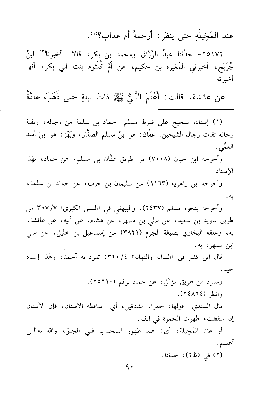 ٢٥١٧٢ - حَدَّثَنَا عَبْدُ الرَّزَّاقِ، وَمُحَمَّدُ بْنُ بَكْرٍ، قَالَا: أَخْبَرَنَا (٢) ابْنُ جُرَيجٍ، أَخْبَرَنِي الْمُغِيرَةُ بْنُ حَكِيمٍ، عَنْ أُمِّ كُلْثُومٍ بِنْتِ أَبِي بَكْرٍ، أَنَّهَا أَخْبَرَتْهُ: عَنْ عَائِشَةَ، قَالَتْ: أَعْتَمَ النَّبِيُّ صَلَّى اللهُ عَلَيْهِ وَسَلَّمَ ذَاتَ لَيْلَةٍ حَتَّى ذَهَبَ عَامَّةُ