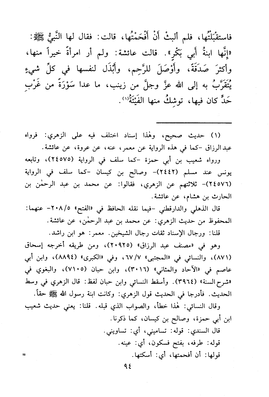 فَاسْتَقْبَلْتُهَا، فَلَمْ أَلْبَثْ أَنْ أَفْحَمْتُهَا، قَالَتْ: فَقَالَ لَهَا النَّبِيُّ صَلَّى اللهُ عَلَيْهِ وَسَلَّمَ: " إِنَّهَا ابْنَةُ أَبِي بَكْرٍ " قَالَتْ عَائِشَةُ: " وَلَمْ أَرَ امْرَأَةً خَيْرًا مِنْهَا، وَأَكْثَرَ صَدَقَةً، وَأَوْصَلَ لِلرَّحِمِ، وَأَبْذَلَ لِنَفْسِهَا فِي كُلِّ شَيْءٍ يُتَقَرَّبُ بِهِ إِلَى اللهِ عَزَّ وَجَلَّ مِنْ زَيْنَبَ، مَا عَدَا سَوْرَةً مِنْ غَرْبٍ حَدٍّ كَانَ فِيهَا، تُوشِكُ مِنْهَا الْفِيئَةَ " (١)