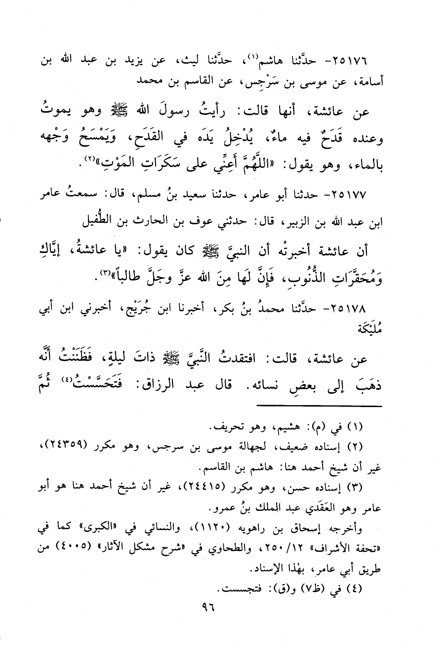 ٢٥١٧٦ - حَدَّثَنَا هَاشِمٌ، (١) حَدَّثَنَا لَيْثٌ، عَنْ يَزِيدَ بْنِ عَبْدِ اللهِ بْنِ أُسَامَةَ، عَنْ مُوسَىِ بْنِ سَرْجِسٍ، عَنِ الْقَاسِمِ بْنِ مُحَمَّدٍ، عَنْ عَائِشَةَ، أَنَّهَا قَالَتْ: رَأَيْتُ رَسُولَ اللهِ صَلَّى اللهُ عَلَيْهِ وَسَلَّمَ وَهُوَ يَمُوتُ وَعِنْدَهُ قَدَحٌ فِيهِ مَاءٌ، يُدْخِلُ يَدَهُ فِي الْقَدَحِ، وَيَمْسَحُ وَجْهَهُ بِالْمَاءِ، وَهُوَ يَقُولُ: " اللهُمَّ أَعِنِّي عَلَى سَكَرَاتِ الْمَوْتِ " (٢)