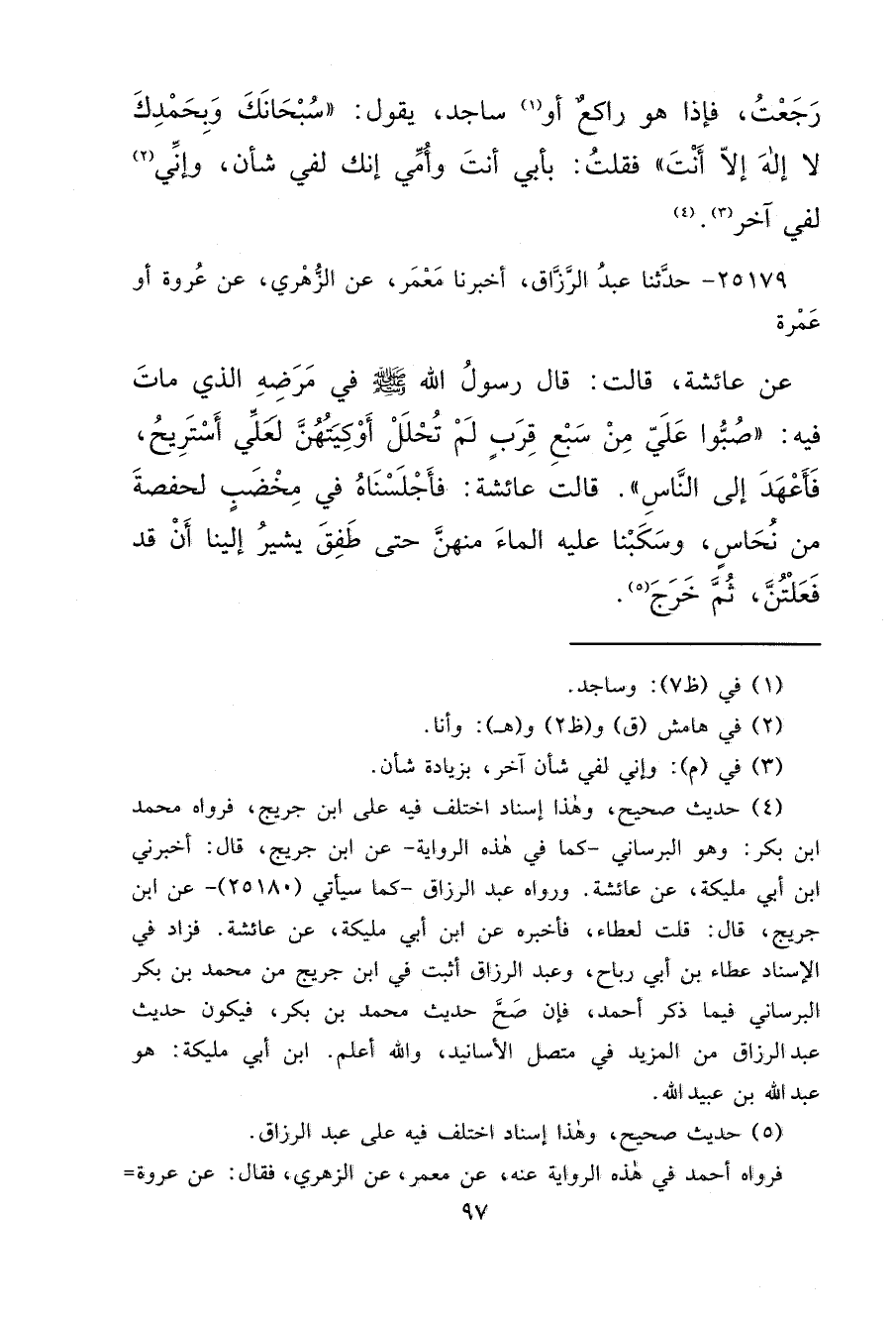 ٢٥١٧٩ - حَدَّثَنَا عَبْدُ الرَّزَّاقِ، أَخْبَرَنَا مَعْمَرٌ، عَنِ الزُّهْرِيِّ، عَنْ عُرْوَةَ، أَوْ عَمْرَةَ، عَنْ عَائِشَةَ، قَالَتْ: قَالَ رَسُولُ اللهِ صَلَّى اللهُ عَلَيْهِ وَسَلَّمَ فِي مَرَضِهِ الَّذِي مَاتَ فِيهِ: " صُبُّوا عَلَيَّ مِنْ سَبْعِ قِرَبٍ لَمْ تُحْلَلْ أَوْكِيَتُهُنَّ لَعَلِّي أَسْتَرِيحُ، فَأَعْهَدَ إِلَى النَّاسِ " قَالَتْ عَائِشَةُ: فَأَجْلَسْنَاهُ فِي مِخْضَبٍ لِحَفْصَةَ مِنْ نُحَاسٍ، وَسَكَبْنَا عَلَيْهِ الْمَاءَ مِنْهُنَّ حَتَّى طَفِقَ يُشِيرُ إِلَيْنَا أَنْ قَدْ فَعَلْتُنَّ، ثُمَّ خَرَجَ (٥)