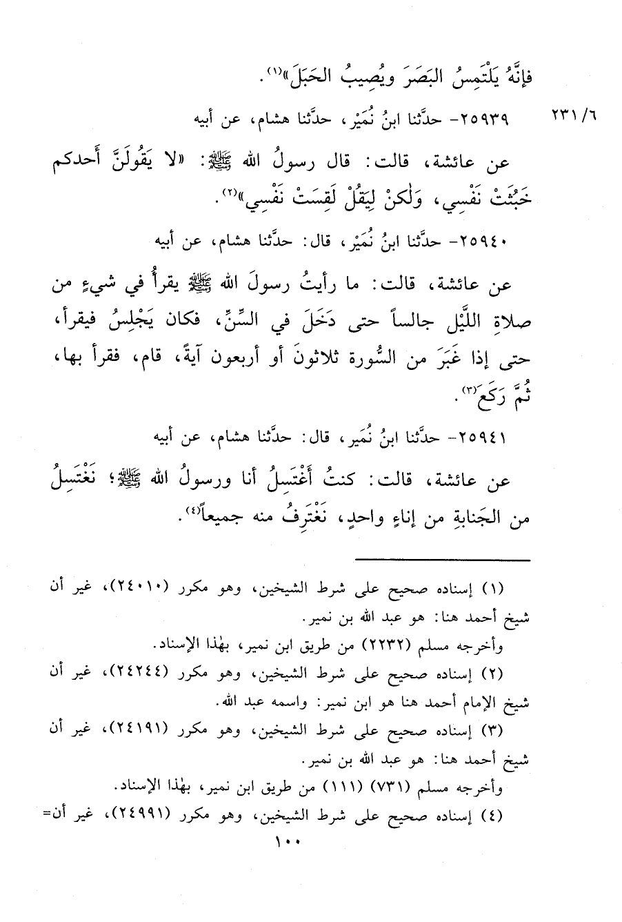 ٢٥٩٤٠ - حَدَّثَنَا ابْنُ نُمَيْرٍ، قَالَ: حَدَّثَنَا هِشَامٌ، عَنْ أَبِيهِ، عَنْ عَائِشَةَ، قَالَتْ: مَا رَأَيْتُ رَسُولَ اللهِ صَلَّى اللهُ عَلَيْهِ وَسَلَّمَ " يَقْرَأُ فِي شَيْءٍ مِنْ صَلَاةِ اللَّيْلِ جَالِسًا، حَتَّى دَخَلَ فِي السِّنِّ، فَكَانَ يَجْلِسُ فَيَقْرَأُ حَتَّى إِذَا غَبَرَ مِنَ السُّورَةِ ثَلَاثُونَ أَوْ أَرْبَعُونَ آيَةً، قَامَ فَقَرَأَ بِهَا ثُمَّ رَكَعَ " (٣)
