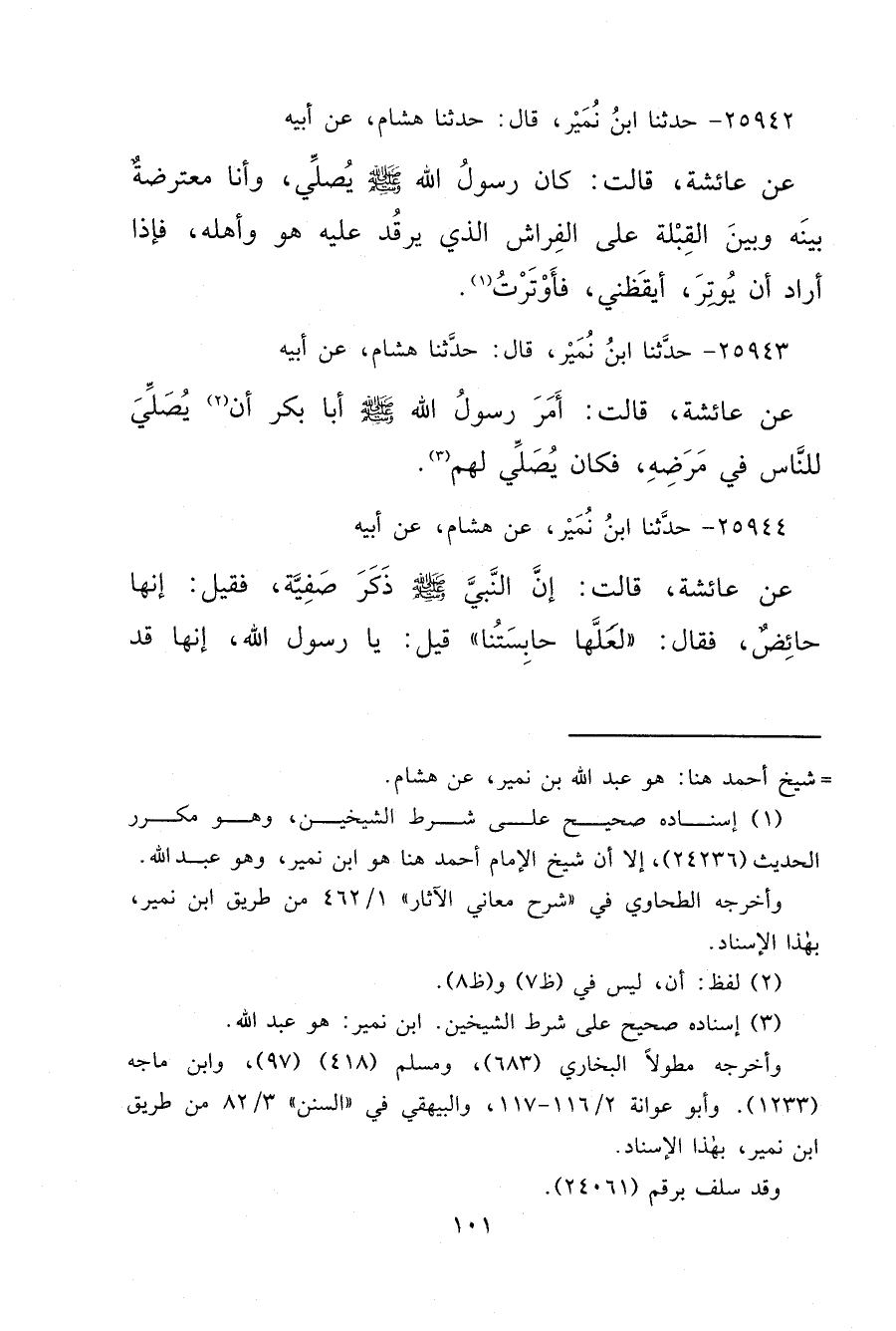 ٢٥٩٤٢ - حَدَّثَنَا ابْنُ نُمَيْرٍ، قَالَ: حَدَّثَنَا هِشَامٌ، عَنْ أَبِيهِ، عَنْ عَائِشَةَ، قَالَتْ: كَانَ رَسُولُ اللهِ صَلَّى اللهُ عَلَيْهِ وَسَلَّمَ " يُصَلِّي وَأَنَا مُعْتَرِضَةٌ بَيْنَهُ وَبَيْنَ الْقِبْلَةِ، عَلَى الْفِرَاشِ الَّذِي يَرْقُدُ عَلَيْهِ، هُوَ وَأَهْلُهُ فَإِذَا أَرَادَ أَنْ يُوتِرَ أَيْقَظَنِي فَأَوْتَرْتُ " (١)