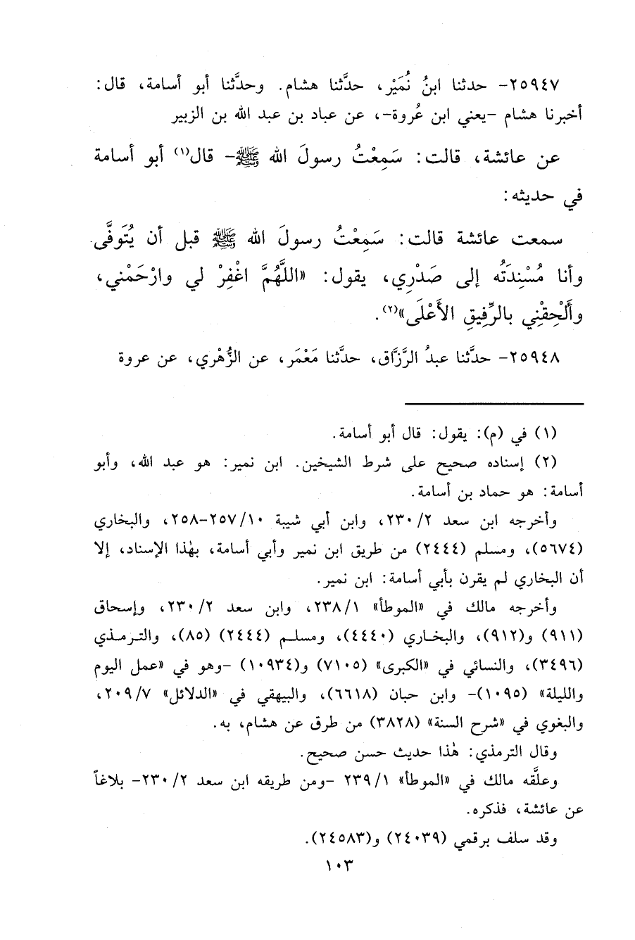 ٢٥٩٤٧ - حَدَّثَنَا ابْنُ نُمَيْرٍ، حَدَّثَنَا هِشَامٌ، وحَدَّثَنَا أَبُو أُسَامَةَ، قَالَ: أَخْبَرَنَا هِشَامٌ يَعْنِي ابْنَ عُرْوَةَ، عَنْ عَبَّادِ بْنِ عَبْدِ اللهِ بْنِ الزُّبَيْرِ، عَنْ عَائِشَةَ، قَالَتْ سَمِعْتُ رَسُولَ اللهِ صَلَّى اللهُ عَلَيْهِ وَسَلَّمَ قَالَ (١) أَبُو أُسَامَةَ: فِي حَدِيثِهِ سَمِعْتُ عَائِشَةَ قَالَتْ: سَمِعْتُ رَسُولَ اللهِ صَلَّى اللهُ عَلَيْهِ وَسَلَّمَ قَبْلَ أَنْ يُتَوَفَّى، وَأَنَا مُسْنِدَتُهُ إِلَى صَدْرِي، يَقُولُ " اللهُمَّ اغْفِرْ لِي وَارْحَمْنِي، وَأَلْحِقْنِي بِالرَّفِيقِ الْأَعْلَى " (٢)