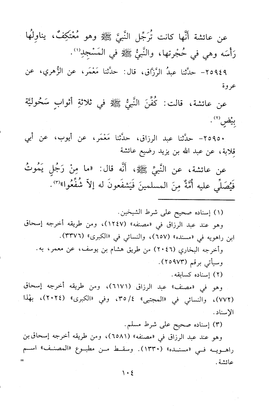 ٢٥٩٤٩ - حَدَّثَنَا عَبْدُ الرَّزَّاقِ، قَالَ: حَدَّثَنَا مَعْمَرٌ، عَنِ الزُّهْرِيِّ، عَنْ عُرْوَةَ، عَنْ عَائِشَةَ، قَالَتْ: " كُفِّنَ النَّبِيُّ صَلَّى اللهُ عَلَيْهِ وَسَلَّمَ فِي ثَلَاثَةِ أَثْوَابٍ سُحُولِيَّةٍ بِيضٍ " (٢)