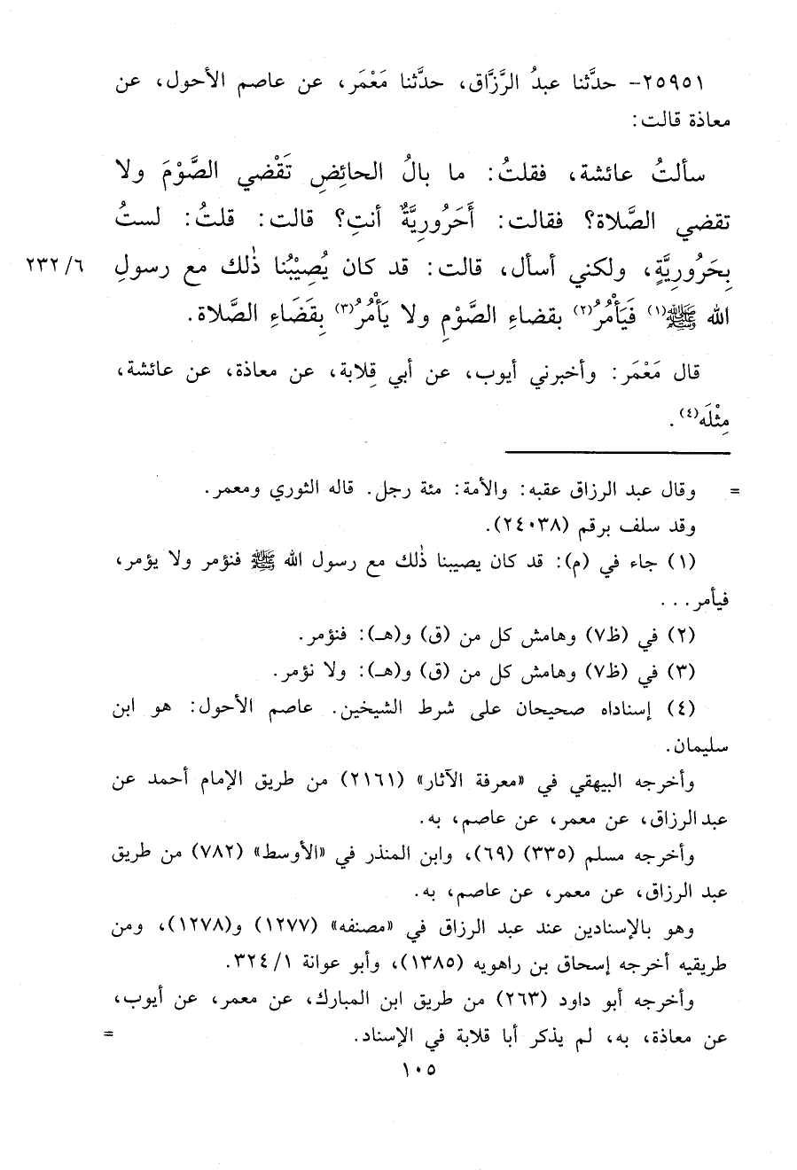 ٢٥٩٥١ - حَدَّثَنَا عَبْدُ الرَّزَّاقِ، حَدَّثَنَا مَعْمَرٌ، عَنْ عَاصِمٍ الْأَحْوَلِ، عَنْ مُعَاذَةَ، قَالَتْ: سَأَلْتُ عَائِشَةَ فَقُلْتُ: مَا بَالُ الْحَائِضِ تَقْضِي الصَّوْمَ، وَلَا تَقْضِي الصَّلَاةَ؟ فَقَالَتْ: أَحَرُورِيَّةٌ أَنْتِ؟ قَالَتْ: قُلْتُ لَسْتُ بِحَرُورِيَّةٍ، وَلَكِنِّي أَسْأَلُ، قَالَتْ: قَدْ كَانَ يُصِيبُنَا ذَلِكَ مَعَ رَسُولِ اللهِ صَلَّى اللهُ عَلَيْهِ وَسَلَّمَ، (١) " فَيَأْمُرُ (٢) بِقَضَاءِ الصَّوْمِ، وَلَا يَأْمُرُ (٣) بِقَضَاءِ الصَّلَاةِ " قَالَ مَعْمَرٌ، وَأَخْبَرَنِي أَيُّوبُ، عَنْ أَبِي قِلَابَةَ، عَنْ مُعَاذَةَ، عَنْ عَائِشَةَ مِثْلَهُ (٤)