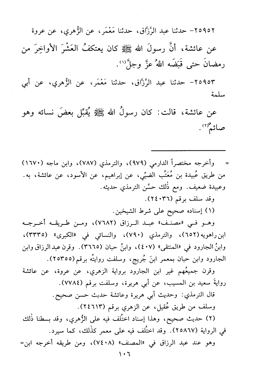 ٢٥٩٥٣ - حَدَّثَنَا عَبْدُ الرَّزَّاقِ، حَدَّثَنَا مَعْمَرٌ، عَنِ الزُّهْرِيِّ، عَنْ أَبِي سَلَمَةَ، عَنْ عَائِشَةَ، قَالَتْ كَانَ رَسُولُ اللهِ صَلَّى اللهُ عَلَيْهِ وَسَلَّمَ " يُقَبِّلُ بَعْضَ نِسَائِهِ، وَهُوَ صَائِمٌ " (٢)