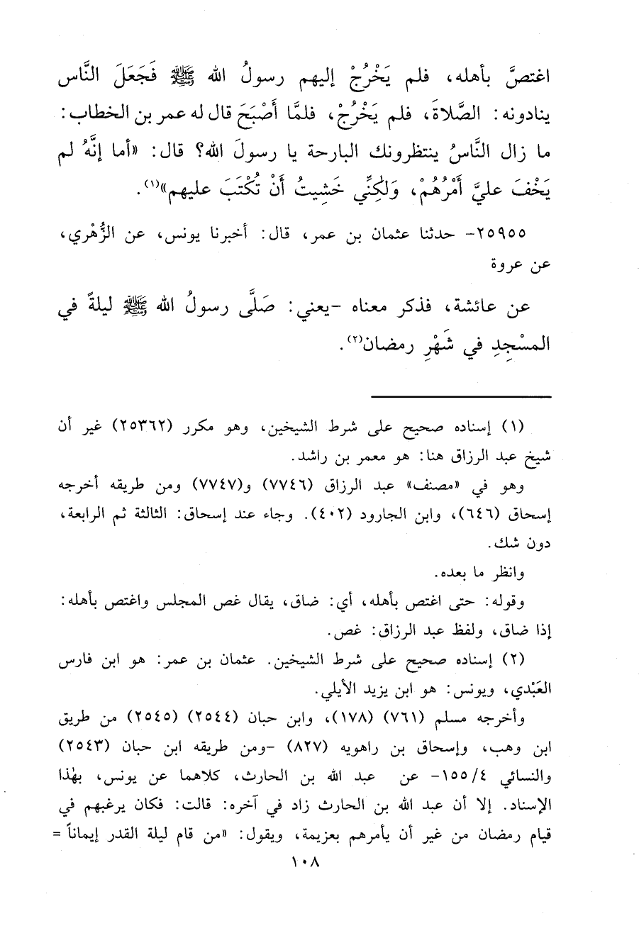٢٥٩٥٥ - حَدَّثَنَا عُثْمَانُ بْنُ عُمَرَ، قَالَ أَخْبَرَنَا يُونُسُ، عَنِ الزُّهْرِيِّ، عَنْ عُرْوَةَ، عَنْ عَائِشَةَ فَذَكَرَ مَعْنَاهُ يَعْنِي صَلَّى رَسُولُ اللهِ صَلَّى اللهُ عَلَيْهِ وَسَلَّمَ لَيْلَةً فِي الْمَسْجِدِ فِي شَهْرِ رَمَضَانَ (٢)