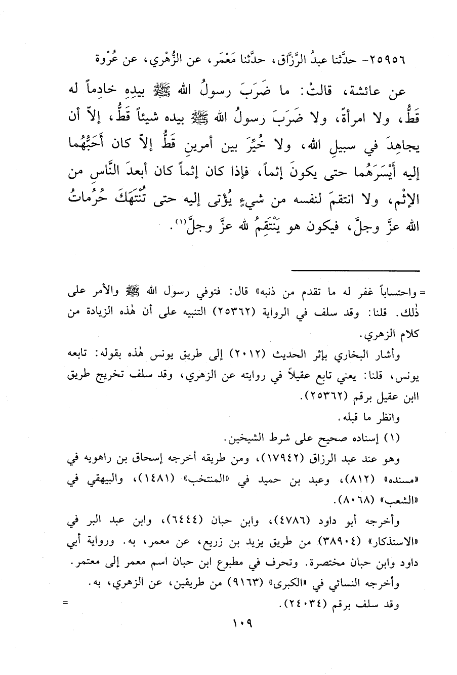 ٢٥٩٥٦ - حَدَّثَنَا عَبْدُ الرَّزَّاقِ، حَدَّثَنَا مَعْمَرٌ، عَنِ الزُّهْرِيِّ، عَنْ عُرْوَةَ، عَنْ عَائِشَةَ، قَالَتْ مَا ضَرَبَ رَسُولُ اللهِ صَلَّى اللهُ عَلَيْهِ وَسَلَّمَ بِيَدِهِ خَادِمًا لَهُ قَطُّ، وَلَا امْرَأَةً، وَلَا ضَرَبَ رَسُولُ اللهِ صَلَّى اللهُ عَلَيْهِ وَسَلَّمَ بِيَدِهِ شَيْئًا قَطُّ، إِلَّا أَنْ يُجَاهِدَ فِي سَبِيلِ اللهِ "