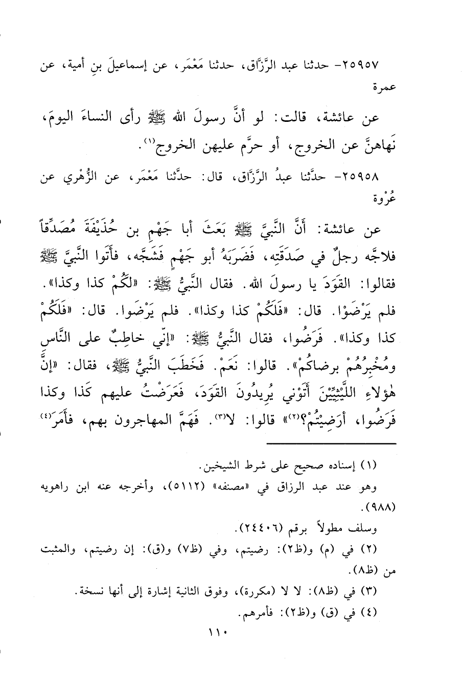 ٢٥٩٥٨ - حَدَّثَنَا عَبْدُ الرَّزَّاقِ، قَالَ: حَدَّثَنَا مَعْمَرٌ، عَنِ الزُّهْرِيِّ، عَنْ عُرْوَةَ، عَنْ عَائِشَةَ، أَنَّ النَّبِيَّ صَلَّى اللهُ عَلَيْهِ وَسَلَّمَ بَعَثَ أَبَا جَهْمِ بْنِ حُذَيْفَةَ مُصَدِّقًا فَلَاجَّهُ رَجُلٌ فِي صَدَقَتِهِ، فَضَرَبَهُ أَبُو جَهْمٍ فَشَجَّهُ، فَأَتَوْا النَّبِيَّ صَلَّى اللهُ عَلَيْهِ وَسَلَّمَ، فَقَالُوا: الْقَوَدَ يَا رَسُولَ اللهِ، فَقَالَ النَّبِيُّ صَلَّى اللهُ عَلَيْهِ وَسَلَّمَ: " لَكُمْ كَذَا وَكَذَا "، فَلَمْ يَرْضَوْا، قَالَ: " فَلَكُمْ كَذَا وَكَذَا "، فَلَمْ يَرْضَوْا، قَالَ: " فَلَكُمْ كَذَا وَكَذَا "، فَرَضُوا، فَقَالَ النَّبِيُّ صَلَّى اللهُ عَلَيْهِ وَسَلَّمَ: " إِنِّي خَاطِبٌ عَلَى النَّاسِ، وَمُخْبِرُهُمْ بِرِضَاكُمْ، قَالُوا: نَعَمْ، فَخَطَبَ النَّبِيُّ صَلَّى اللهُ عَلَيْهِ وَسَلَّمَ فَقَالَ: " إِنَّ هَؤُلَاءِ اللَّيْثِيِّينَ أَتَوْنِي يُرِيدُونَ الْقَوَدَ، فَعَرَضْتُ عَلَيْهِمْ كَذَا وَكَذَا، فَرَضُوا، أَرَضِيتُمْ؟، (٢) قَالُوا: لَا، (٣) فَهَمَّ الْمُهَاجِرُونَ بِهِمْ، فَأَمَرَ (٤)
