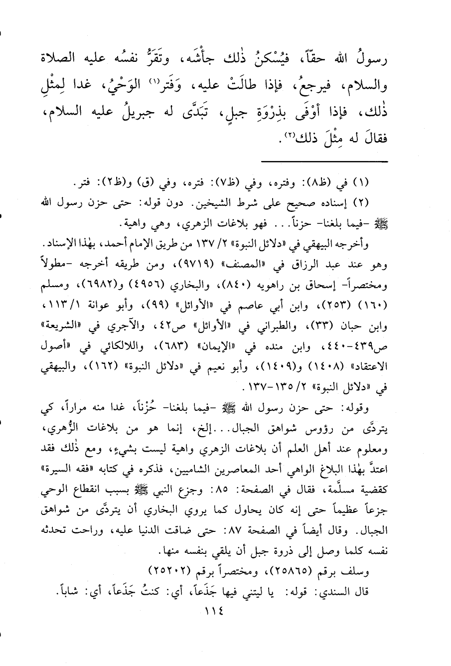 وقوله: حتى حزن رسول الله صَلَّى اللهُ عَلَيْهِ وَسَلَّمَ - فيما بلغنا - حُزْناً، غدا منه مراراً، كي يتردَّى من رؤوس شواهق الجبال ... إلخ، إنما هو من بلاغات الزهري، ومعلوم عند أهل العلم أن بلاغات الزهري واهية ليست بشيءٍ، ومع ذلك فقد اعتدَّ بهذا البلاغ الواهي أحد المعاصرين الشاميين، فذكره فىِ كتابه "فقه السيرة" كقضية مسلَّمة، فقال في الصفحة: ٨٥: وجزع النبي صَلَّى اللهُ عَلَيْهِ وَسَلَّمَ بسبب انقطاع الوحي جزعاً عظيماً حتى إنه كان يحاول كما يروي البخاري أن يتردَّى من شواهق