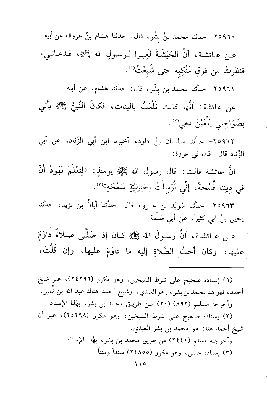 ٢٥٩٦٠ - حَدَّثَنَا مُحَمَّدُ بْنُ بِشْرٍ، قَالَ: حَدَّثَنَا هِشَامُ بْنُ عُرْوَةَ، عَنْ أَبِيهِ، عَنْ عَائِشَةَ، " أَنَّ الْحَبَشَةَ، لَعِبُوا لِرَسُولِ اللهِ صَلَّى اللهُ عَلَيْهِ وَسَلَّمَ فَدَعَانِي، فَنَظَرْتُ مِنْ فَوْقِ مَنْكِبِهِ حَتَّى شَبِعْتُ " (١)