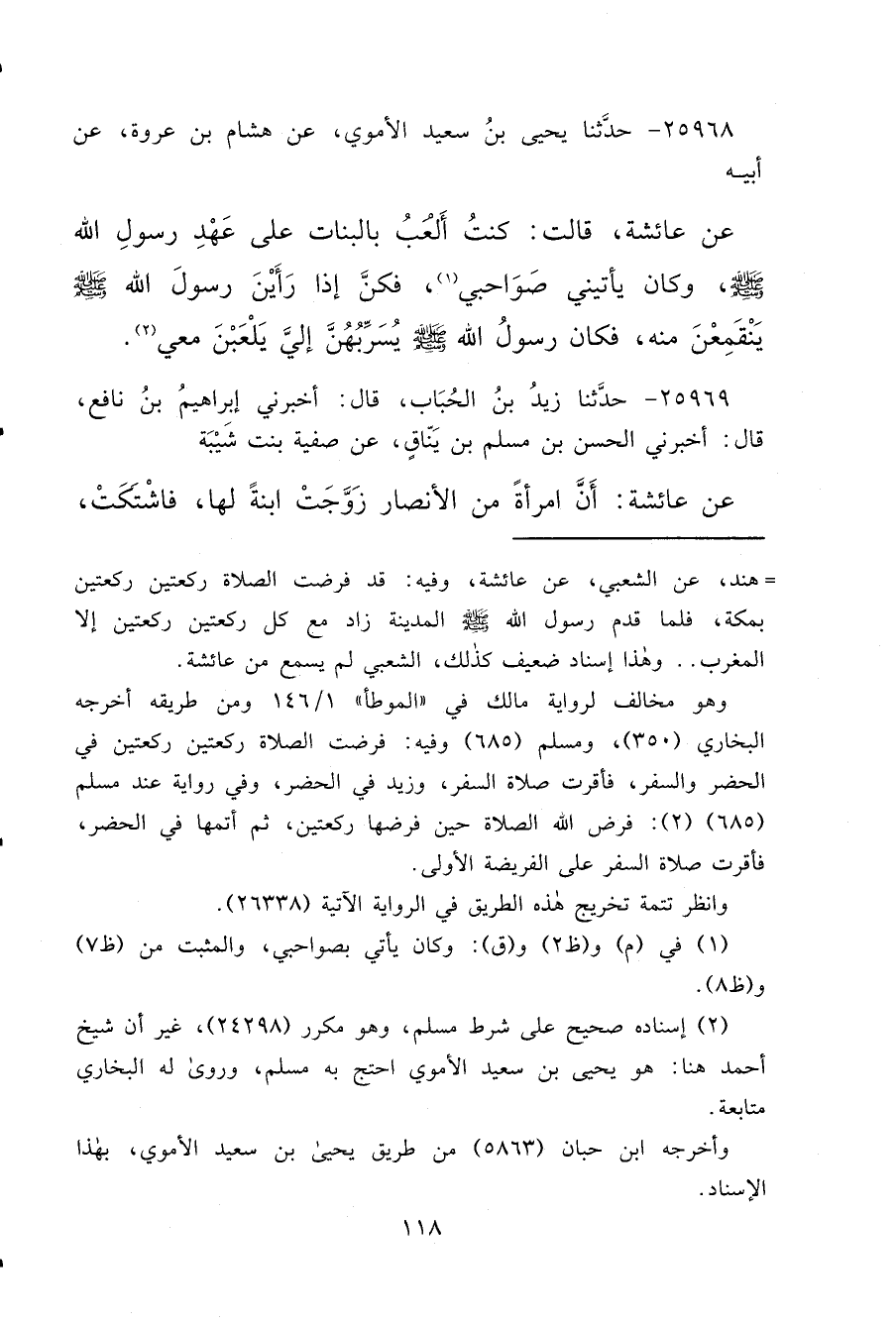 ٢٥٩٦٨ - حَدَّثَنَا يَحْيَى بْنُ سَعِيدٍ الْأُمَوِيُّ، عَنْ هِشَامِ بْنِ عُرْوَةَ، عَنْ أَبِيهِ، عَنْ عَائِشَةَ، قَالَتْ كُنْتُ أَلْعَبُ بِالْبَنَاتِ عَلَى عَهْدِ رَسُولِ اللهِ صَلَّى اللهُ عَلَيْهِ وَسَلَّمَ، وَكَانَ يَأْتِينِي صَوَاحِبِي (١) فَكُنَّ إِذَا رَأَيْنَ رَسُولَ اللهِ صَلَّى اللهُ عَلَيْهِ وَسَلَّمَ يَنْقَمِعْنَ مِنْهُ، فَكَانَ رَسُولُ اللهِ صَلَّى اللهُ عَلَيْهِ وَسَلَّمَ يُسَرِّبُهُنَّ إِلَيَّ يَلْعَبْنَ مَعِي " (٢)