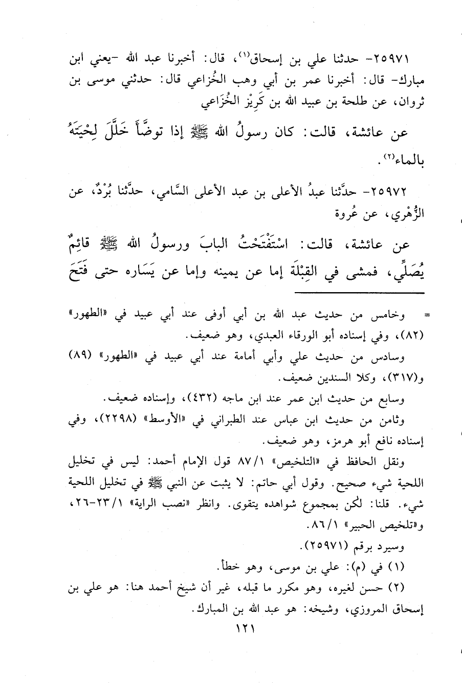 ٢٥٩٧١ - حَدَّثَنَا عَلِيُّ بْنُ إِسْحَاقَ، (١) قَالَ: أَخْبَرَنَا عَبْدُ اللهِ يَعْنِي ابْنَ مُبَارَكٍ، قَالَ: أَخْبَرَنَا عُمَرُ بْنُ أَبِي وَهْبٍ الْخُزَاعِيُّ، قَالَ: حَدَّثَنِي مُوسَى بْنُ ثَرْوَانَ، عَنْ طَلْحَةَ بْنِ عُبَيْدِ اللهِ بْنِ كُرَيْزٍ الْخُزَاعِيِّ، عَنْ عَائِشَةَ، قَالَتْ كَانَ رَسُولُ اللهِ صَلَّى اللهُ عَلَيْهِ وَسَلَّمَ " إِذَا تَوَضَّأَ خَلَّلَ لِحْيَتَهُ بِالْمَاءِ " (٢)
