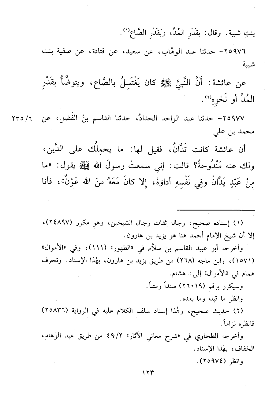٢٥٩٧٦ - حَدَّثَنَا عَبْدُ الْوَهَّابِ، عَنْ سَعِيدٍ، عَنْ قَتَادَةَ، عَنْ صَفِيَّةَ بِنْتِ شَيْبَةَ، عَنْ عَائِشَةَ، أَنَّ النَّبِيَّ صَلَّى اللهُ عَلَيْهِ وَسَلَّمَ كَانَ " يَغْتَسِلُ بِالصَّاعِ، وَيَتَوَضَّأُ بِقَدْرِ الْمُدِّ " أَوْ نَحْوِهِ (٢)