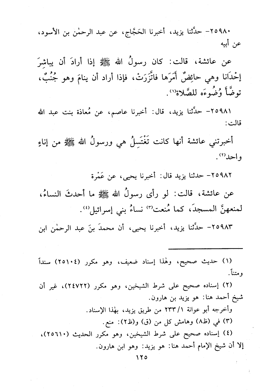 ٢٥٩٨٠ - حَدَّثَنَا يَزِيدُ، أَخْبَرَنَا الْحَجَّاجُ، عَنْ عَبْدِ الرَّحْمَنِ بْنِ الْأَسْوَدِ، عَنْ أَبِيهِ، عَنْ عَائِشَةَ، قَالَتْ كَانَ رَسُولُ اللهِ صَلَّى اللهُ عَلَيْهِ وَسَلَّمَ " إِذَا أَرَادَ أَنْ " يُبَاشِرَ إِحْدَانَا، وَهِيَ حَائِضٌ أَمَرَهَا فَاتَّزَرَتْ، فَإِذَا أَرَادَ أَنْ يَنَامَ، وَهُوَ جُنُبٌ تَوَضَّأَ، وُضُوءَهُ لِلصَّلَاةِ " (١)