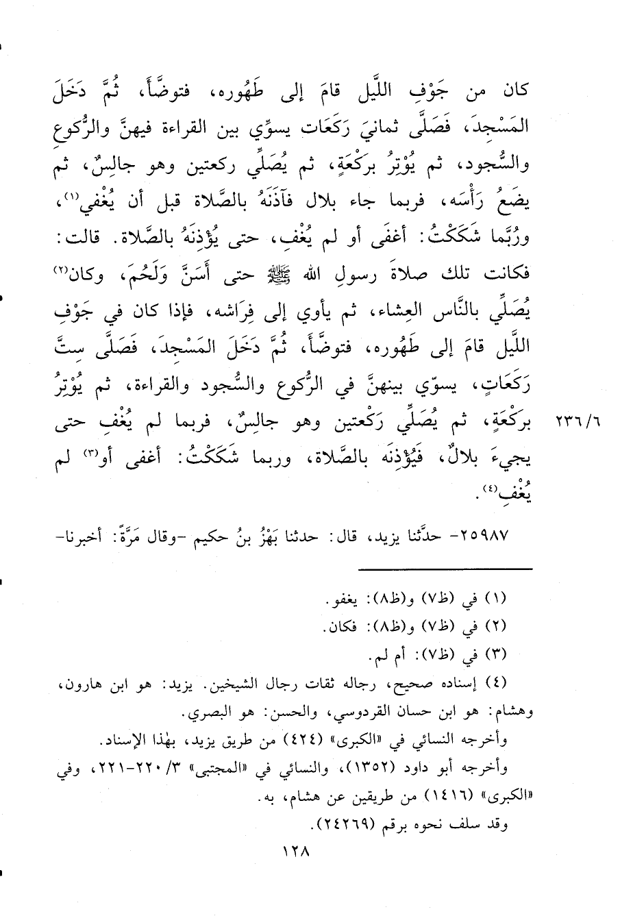 كَانَ مِنْ جَوْفِ اللَّيْلِ قَامَ إِلَى طَهُورِهِ، فَتَوَضَّأَ ثُمَّ دَخَلَ الْمَسْجِدَ فَصَلَّى ثَمَانِيَ رَكَعَاتٍ، يُسَوِّي بَيْنَ الْقِرَاءَةِ فِيهِنَّ، وَالرُّكُوعِ وَالسُّجُودِ، ثُمَّ يُوتِرُ بِرَكْعَةٍ، ثُمَّ يُصَلِّي رَكْعَتَيْنِ وَهُوَ جَالِسٌ، ثُمَّ يَضَعُ رَأْسَهُ، فَرُبَّمَا جَاءَ بِلَالٌ فَآذَنَهُ بِالصَّلَاةِ، قَبْلَ أَنْ يُغْفِيَ (١) ، وَرُبَّمَا شَكَكْتُ أَغْفَى، أَوْ لَمْ يُغْفِ حَتَّى يُؤْذِنَهُ بِالصَّلَاةِ، قَالَتْ: فَكَانَتْ تِلْكَ صَلَاةُ رَسُولِ اللهِ صَلَّى اللهُ عَلَيْهِ وَسَلَّمَ حَتَّى أَسَنَّ وَلَحُمَ، وَكَانَ (٢) يُصَلِّي بِالنَّاسِ الْعِشَاءَ، ثُمَّ يَأْوِي إِلَى فِرَاشِهِ، فَإِذَا كَانَ فِي جَوْفِ اللَّيْلِ قَامَ إِلَى طَهُورِهِ، فَتَوَضَّأَ ثُمَّ دَخَلَ الْمَسْجِدَ فَصَلَّى سِتَّ رَكَعَاتٍ، يُسَوِّي بَيْنَهُنَّ فِي الرُّكُوعِ وَالسُّجُودِ وَالْقِرَاءَةِ، ثُمَّ يُوتِرُ بِرَكْعَةٍ، ثُمَّ يُصَلِّي رَكْعَتَيْنِ وَهُوَ جَالِسٌ، فَرُبَّمَا لَمْ يُغْفِ حَتَّى يَجِيءَ بِلَالٌ فَيُؤْذِنَهُ بِالصَّلَاةِ، وَرُبَّمَا شَكَكْتُ أَغْفَى أَوْ (٣) لَمْ يُغْفِ " (٤)
