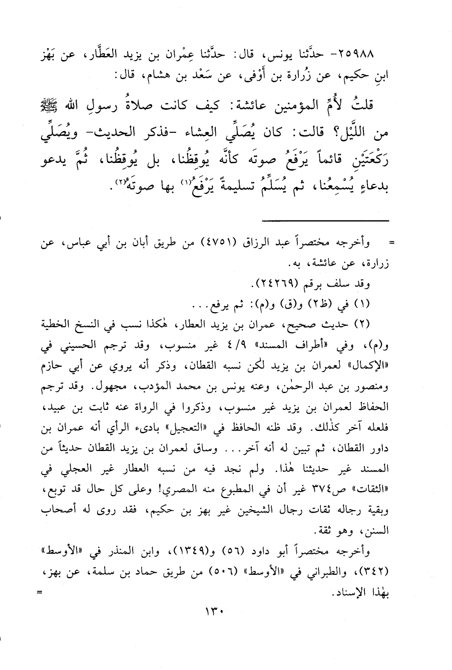 ٢٥٩٨٨ - حَدَّثَنَا يُونُسُ، قَالَ: حَدَّثَنَا عِمْرَانُ بْنُ يَزِيدَ الْعَطَّارُ، عَنْ بَهْزِ بْنِ حَكِيمٍ، عَنْ زُرَارَةَ بْنِ أَوْفَى، عَنْ سَعْدِ بْنِ هِشَامٍ، قَالَ: قُلْتُ لِأُمِّ الْمُؤْمِنِينَ عَائِشَةَ: كَيْفَ كَانَتْ صَلَاةُ رَسُولِ اللهِ صَلَّى اللهُ عَلَيْهِ وَسَلَّمَ مِنَ اللَّيْلِ؟ قَالَتْ: " كَانَ يُصَلِّي الْعِشَاءَ - فَذَكَرَ الْحَدِيثَ - " وَيُصَلِّي رَكْعَتَيْنِ قَائِمًا يَرْفَعُ صَوْتَهُ، كَأَنَّهُ يُوقِظُنَا، بَلْ يُوقِظُنَا، ثُمَّ يَدْعُو بِدُعَاءٍ يُسْمِعُنَا، ثُمَّ يُسَلِّمُ تَسْلِيمَةً، يَرْفَعُ بِهَا (١) صَوْتَهُ " (٢)