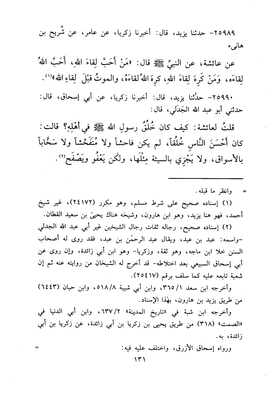 ٢٥٩٨٩ - حَدَّثَنَا يَزِيدُ، قَالَ: أَخْبَرَنَا زَكَرِيَّا، عَنْ عَامِرٍ، عَنْ شُرَيْحِ بْنِ هَانِئٍ، عَنْ عَائِشَةَ، عَنِ النَّبِيِّ صَلَّى اللهُ عَلَيْهِ وَسَلَّمَ قَالَ: " مَنْ أَحَبَّ لِقَاءَ اللهِ، أَحَبَّ اللهُ لِقَاءَهُ، وَمَنْ كَرِهَ لِقَاءَ اللهِ، كَرِهَ اللهُ لِقَاءَهُ، وَالْمَوْتُ قَبْلَ لِقَاءِ اللهِ " (١)