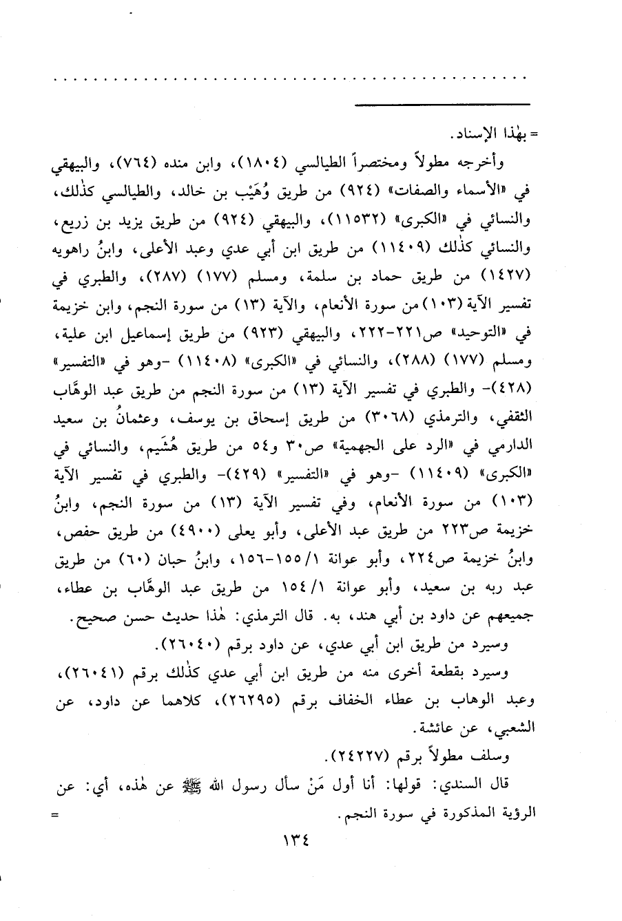 وأخرجه مطولاً ومختصراً الطيالسي (١٨٠٤) ، وابن منده (٧٦٤) ، والبيهقي في "الأسماء والصفات " (٩٢٤) من طريق وُهَيْب بن خالد، والطيالسي كذلك، والنسائي في "الكبرى" (١١٥٣٢) ، والبيهقي ٩٢٤١) من طريق يزيد بن زريع، والنَّسائى كذلك (١١٤٠٩) من طريق ابن أبي عدي وعبد الأعلى، وابنُ راهويه (١٤٢٧) من طريق حماد بن سلمة، ومسلم (١٧٧) (٢٨٧) ، والطبري في تفسير الآية (١٠٣) من سورة الأنعام، والآية (١٣) من سورة النجم، وابن خزيمة في "التوحيد" ص ٢٢١-٢٢٢، والبيهقي (٩٢٣) من طريق إسماعيل ابن علية، ومسلم (١٧٧) (٢٨٨) ، والنَّسائى في "الكبرى" (١١٤٠٨) - وهو في "التفسير" (٤٢٨) - والطبري في تفسير الآية (١٣) من سورة النجم من طريق عبد الوهَّاب الثقفي، والترمذي (٣٠٦٨) من طريق إسحاق بن يوسف، وعثمانُ بن سعيد الدارمي في "الرد على الجهمية" ص ٣٠ و٥٤ من طريق هُشَيم، والنسائي في