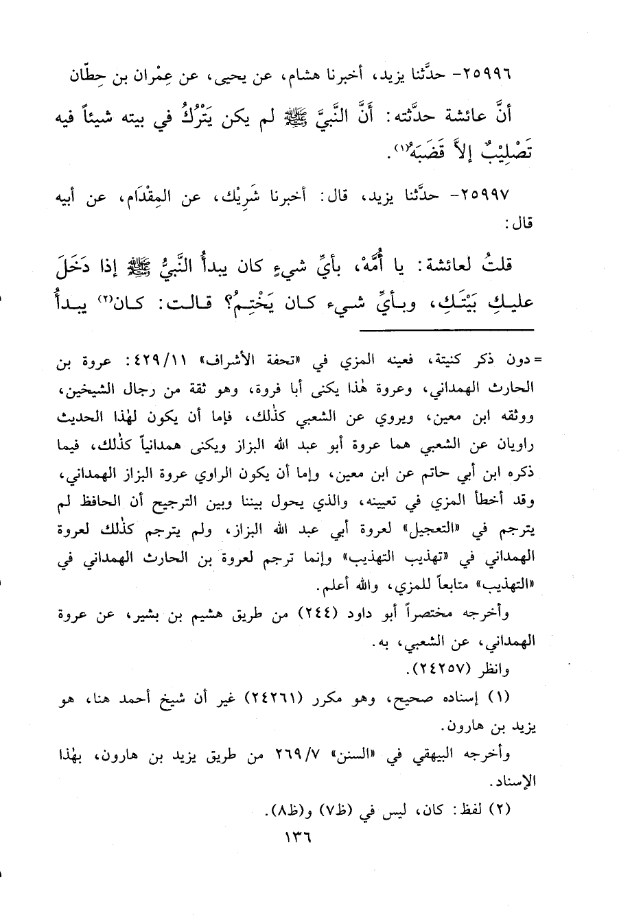 ٢٥٩٩٦ - حَدَّثَنَا يَزِيدُ، أَخْبَرَنَا هِشَامٌ، عَنْ يَحْيَى، عَنْ عِمْرَانَ بْنِ حِطَّانَ، أَنَّ عَائِشَةَ حَدَّثَتْهُ أَنَّ النَّبِيَّ صَلَّى اللهُ عَلَيْهِ وَسَلَّمَ: " لَمْ يَكُنْ يَتْرُكُ فِي بَيْتِهِ شَيْئًا فِيهِ تَصْلِيبٌ إِلَّا قَضَبَهُ " (١)