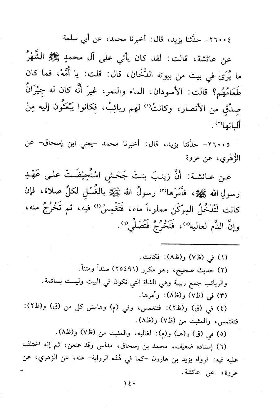 ٢٦٠٠٥ - حَدَّثَنَا يَزِيدُ، قَالَ: أَخْبَرَنَا مُحَمَّدٌ يَعْنِي ابْنَ إِسْحَاقَ، عَنِ الزُّهْرِيِّ، عَنْ عُرْوَةَ، عَنْ عَائِشَةَ، أَنَّ زَيْنَبَ بِنْتَ جَحْشٍ، اسْتُحِيضَتْ عَلَى عَهْدِ رَسُولِ اللهِ صَلَّى اللهُ عَلَيْهِ وَسَلَّمَ فَأَمَرَهَا (٣) رَسُولُ اللهِ صَلَّى اللهُ عَلَيْهِ وَسَلَّمَ " بِالْغُسْلِ لِكُلِّ صَلَاةٍ "، فَإِنْ كَانَتْ لَتَدْخُلُ الْمِرْكَنَ، مَمْلُوءً مَاءً فَتَغْمِسُ (٤) فِيهِ ثُمَّ تَخْرُجُ مِنْهُ، وَإِنَّ الدَّمَ لَعَالِيهِ (٥) فَتَخْرُجُ فَتُصَلِّي (٦)