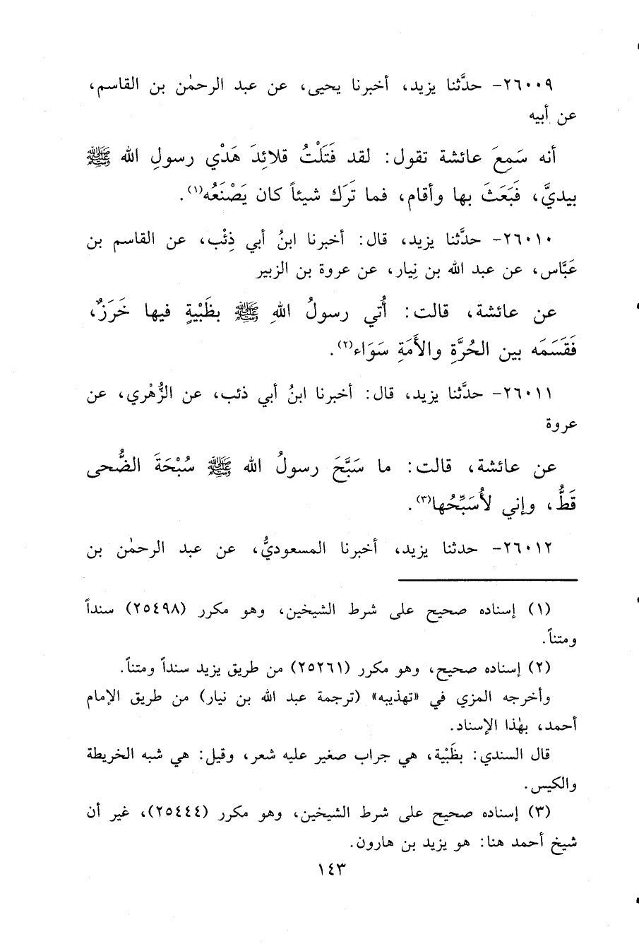 ٢٦٠٠٩ - حَدَّثَنَا يَزِيدُ، أَخْبَرَنَا يَحْيَى، عَنْ عَبْدِ الرَّحْمَنِ بْنِ الْقَاسِمِ، عَنْ أَبِيهِ، أَنَّهُ سَمِعَ عَائِشَةَ، تَقُولُ: لَقَدْ فَتَلْتُ قَلَائِدَ هَدْيِ رَسُولِ اللهِ صَلَّى اللهُ عَلَيْهِ وَسَلَّمَ بِيَدَيَّ، فَبَعَثَ بِهَا وَأَقَامَ، فَمَا تَرَكَ شَيْئًا كَانَ يَصْنَعُهُ " (١)