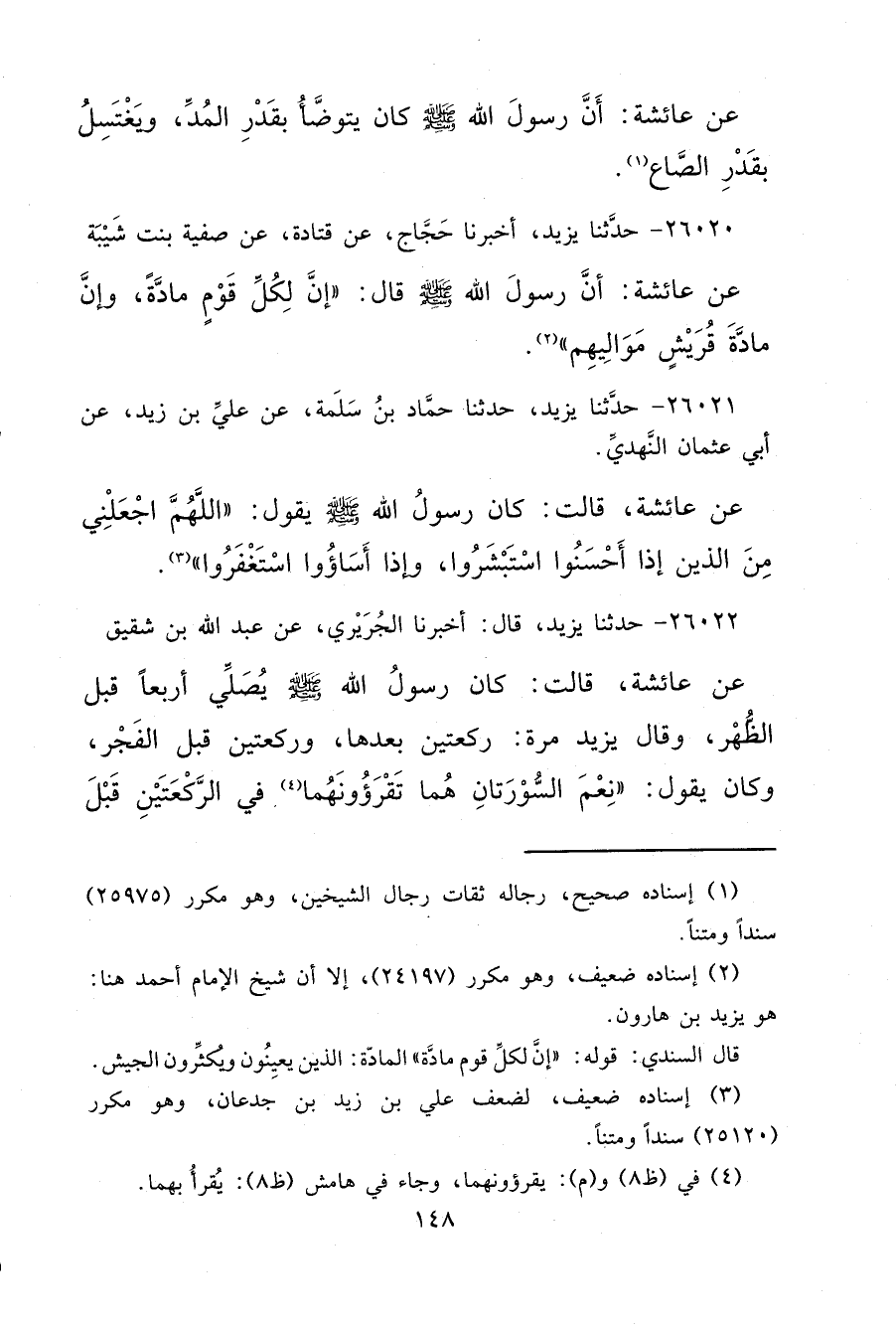 ٢٦٠٢٢ - حَدَّثَنَا يَزِيدُ، قَالَ: أَخْبَرَنَا الْجُرَيْرِيُّ، عَنْ عَبْدِ اللهِ بْنِ شَقِيقٍ، عَنْ عَائِشَةَ، قَالَتْ: كَانَ رَسُولُ اللهِ صَلَّى اللهُ عَلَيْهِ وَسَلَّمَ " يُصَلِّي أَرْبَعًا قَبْلَ الظُّهْرِ "، وَقَالَ يَزِيدُ مَرَّةً رَكْعَتَيْنِ بَعْدَهَا، وَرَكْعَتَيْنِ قَبْلَ الْفَجْرِ، وَكَانَ يَقُولُ: نِعْمَ السُّورَتَانِ هُمَا، تَقْرَؤُونَهُمَا (٤) فِي الرَّكْعَتَيْنِ قَبْلَ