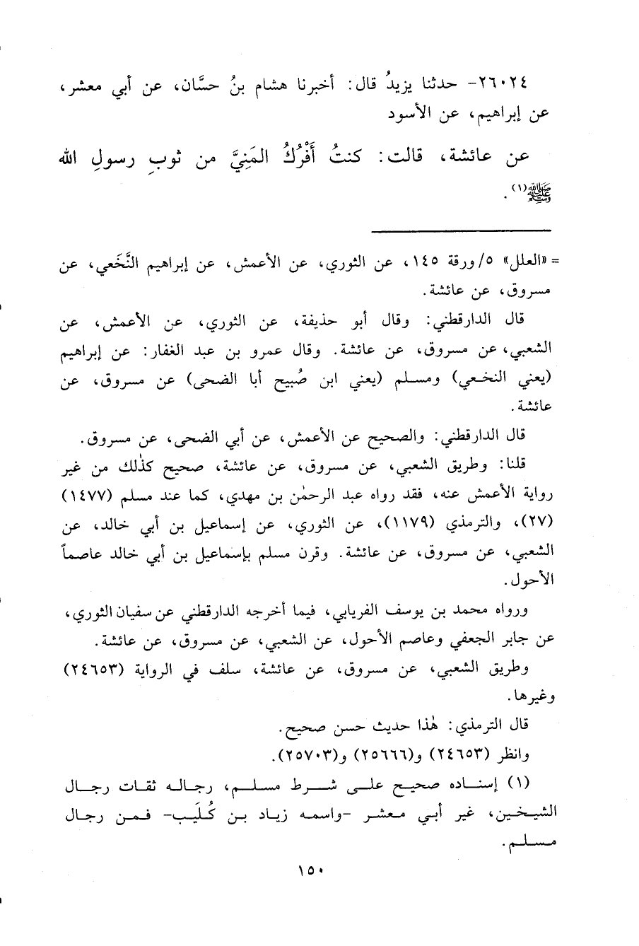 = "العلل " ٥/ورقة ١٤٥، عن الثوري، عن الأعمش، عن إبراهيم النَخَعي، عن مسروق، عن عائشة.