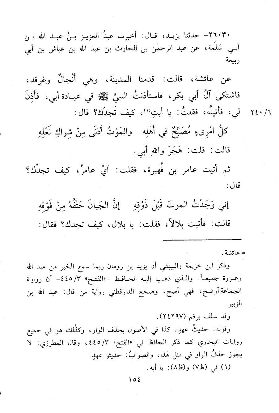 قَالَتْ: فَأَتَيْتُ بِلَالًا فَقُلْتُ يَا بِلَالُ كَيْفَ تَجِدُكَ؟ فَقَالَ: