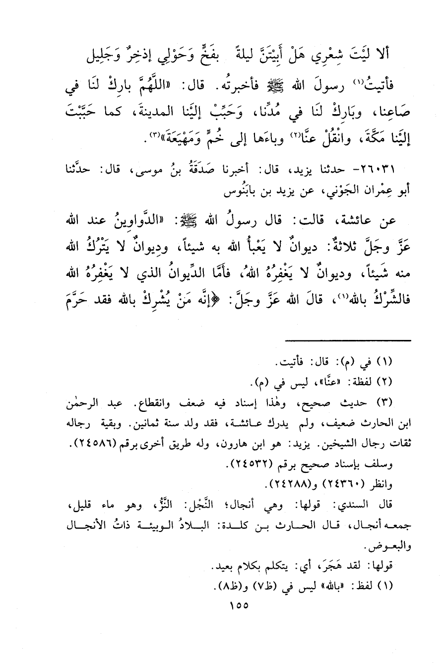 ٢٦٠٣١ - حَدَّثَنَا يَزِيدُ، قَالَ: أَخْبَرَنَا صَدَقَةُ بْنُ مُوسَى، قَالَ: حَدَّثَنَا أَبُو عِمْرَانَ الْجَوْنِيُّ، عَنْ يَزِيدَ بْنِ بَابَنُوسَ، عَنْ عَائِشَةَ، قَالَتْ: قَالَ رَسُولُ اللهِ صَلَّى اللهُ عَلَيْهِ وَسَلَّمَ " الدَّوَاوِينُ عِنْدَ اللهِ عَزَّ وَجَلَّ ثَلَاثَةٌ: دِيوَانٌ لَا يَعْبَأُ اللهُ بِهِ شَيْئًا، وَدِيوَانٌ لَا يَتْرُكُ اللهُ مِنْهُ شَيْئًا، وَدِيوَانٌ لَا يَغْفِرُهُ اللهُ، فَأَمَّا الدِّيوَانُ الَّذِي لَا يَغْفِرُهُ اللهُ: فَالشِّرْكُ بِاللهِ، (٤) قَالَ اللهُ عَزَّ وَجَلَّ {إِنَّهُ مَنْ يُشْرِكْ بِاللهِ، فَقَدْ حَرَّمَ