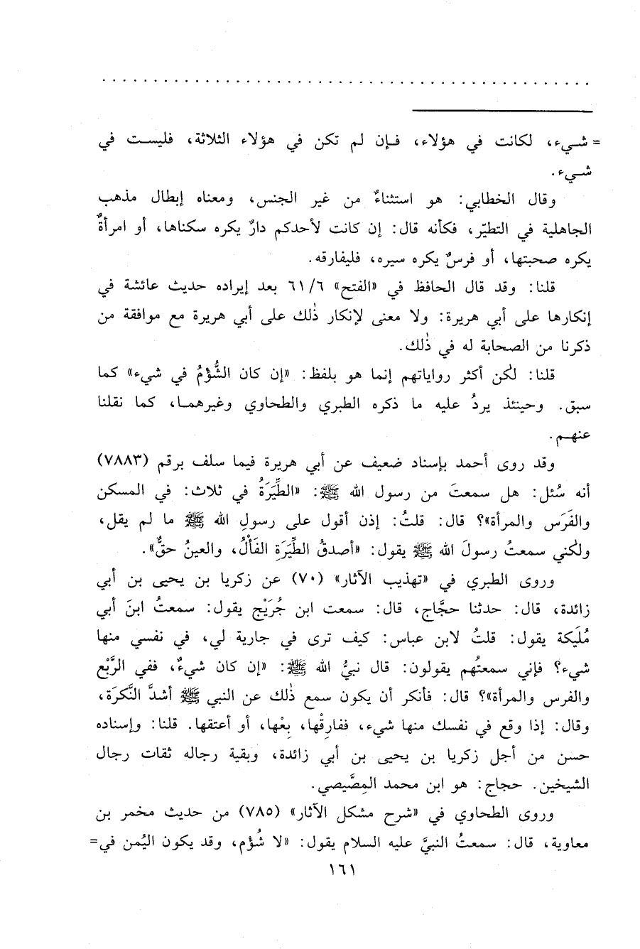 وروى الطبرى في "تهذيب الآثار" (٧٠) عن زكريا بن يحيى بن أبى زائدة، قال: حدثنا حجاج، قال: سمعت ابن جُرَيْج يقول: سمعتُ ابنَ أبى مُلَيكة يقول: قلتُ لابن عباس: كيف ترى في جارية لي، في نفسي منها شيء؟ فإني سمعتُهم يقولون: قال نبيُّ الله صَلَّى اللهُ عَلَيْهِ وَسَلَّمَ": إن كان شيءٌ، ففي الرَبْع والفرس والمرأة"؟ قال: فأنكر أن يكون سمع ذلك عن النبي صَلَّى اللهُ عَلَيْهِ وَسَلَّمَ أشدَّ النَّكرَة، وقال: إذا وقع في نفسك منها شيء، ففارِقْها، بِعْها، أو أعتقها. قلنا: وإسناده حسن من أجل زكريا بن يحيى بن أبي زائدة، وبقية رجاله ثقات رجال الشيخين. حجاج: هو ابن محمد المِصَّيصي.