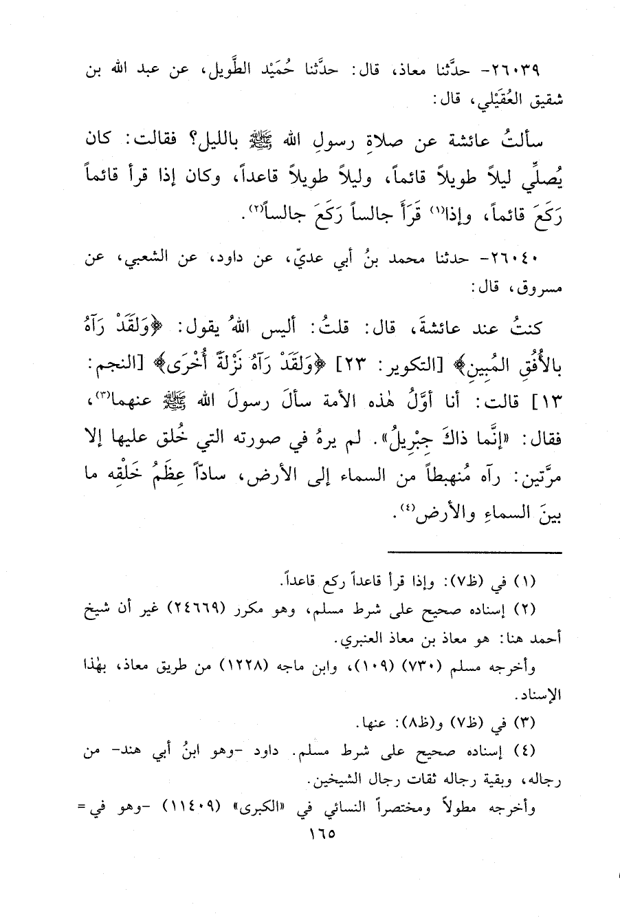 ٢٦٠٤٠ - حَدَّثَنَا مُحَمَّدُ بْنُ أَبِي عَدِيٍّ، عَنْ دَاوُدَ، عَنِ الشَّعْبِيِّ، عَنْ مَسْرُوقٍ، قَالَ: كُنْتُ عِنْدَ عَائِشَةَ قَالَ: قُلْتُ أَلَيْسَ اللهُ يَقُولُ: {وَلَقَدْ رَآهُ بِالْأُفُقِ الْمُبِينِ} [التكوير: ٢٣] {وَلَقَدْ رَآهُ نَزْلَةً أُخْرَى} [النجم: ١٣] قَالَتْ: أَنَا أَوَّلُ هَذِهِ الْأُمَّةِ سَأَلَ رَسُولَ اللهِ صَلَّى اللهُ عَلَيْهِ وَسَلَّمَ عَنْهُمَا، (٣) فَقَالَ " إِنَّمَا ذَاكِ جِبْرِيلُ لَمْ يَرَهُ فِي صُورَتِهِ الَّتِي خُلِقَ عَلَيْهَا، إِلَّا مَرَّتَيْنِ رَآهُ مُنْهَبِطًا مِنَ السَّمَاءِ إِلَى الْأَرْضِ سَادًّا عِظَمُ خَلْقِهِ مَا بَيْنَ السَّمَاءِ وَالْأَرْضِ " (٤)