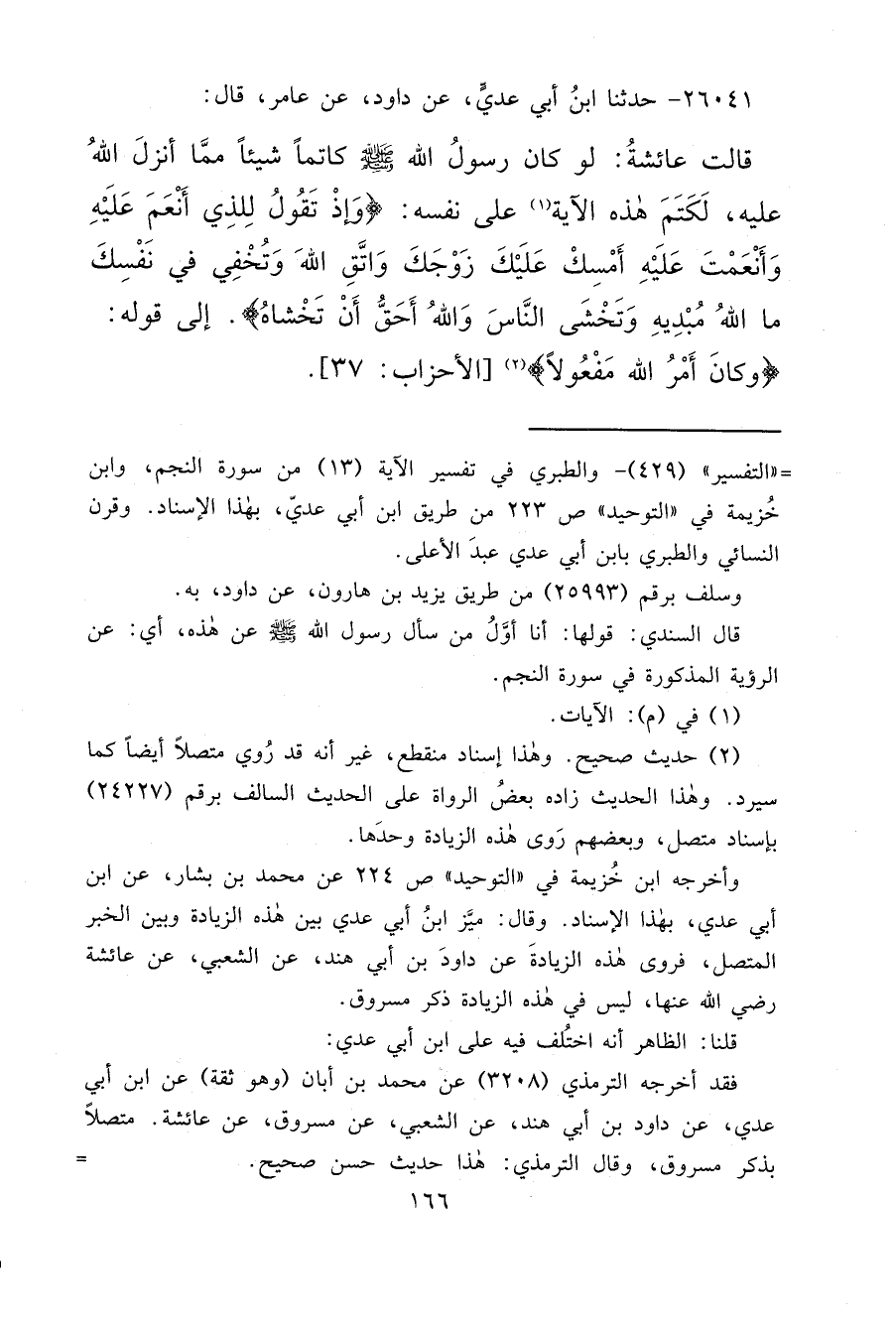 ٢٦٠٤١ - حَدَّثَنَا ابْنُ أَبِي عَدِيٍّ، عَنْ دَاوُدَ، عَنْ عَامِرٍ، قَالَ: قَالَتْ عَائِشَةُ " لَوْ كَانَ رَسُولُ اللهِ صَلَّى اللهُ عَلَيْهِ وَسَلَّمَ كَاتِمًا شَيْئًا مِمَّا أَنْزَلَ اللهُ عَلَيْهِ، لَكَتَمَ هَذِهِ الْآَيَةَ (١) عَلَى نَفْسِهِ {وَإِذْ تَقُولُ لِلَّذِي أَنْعَمَ اللهُ عَلَيْهِ، وَأَنْعَمْتَ عَلَيْهِ، أَمْسِكْ عَلَيْكَ زَوْجَكَ، وَاتَّقِ اللهَ، وَتُخْفِي فِي نَفْسِكَ مَا اللهُ مُبْدِيهِ، وَتَخْشَى النَّاسَ، وَاللهُ أَحَقُّ أَنْ تَخْشَاهُ} [الأحزاب: ٣٧] إِلَى قَوْلِهِ {وَكَانَ أَمْرُ اللهِ مَفْعُولًا} (٢) [النساء: ٤٧] "