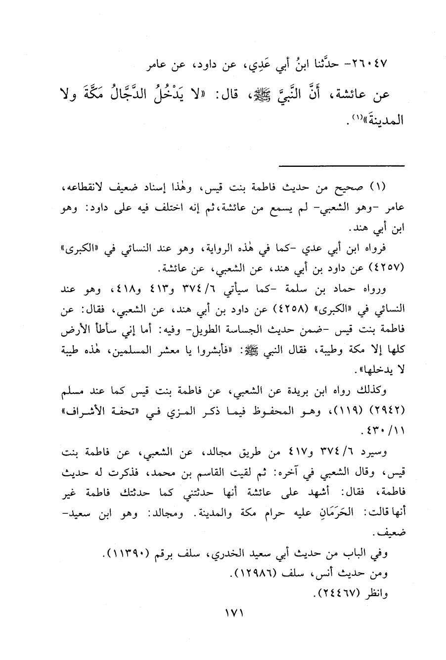 ٢٦٠٤٧ - حَدَّثَنَا ابْنُ أَبِي عَدِيٍّ، عَنْ دَاوُدَ، عَنْ عَامِرٍ، عَنْ عَائِشَةَ، أَنَّ النَّبِيَّ صَلَّى اللهُ عَلَيْهِ وَسَلَّمَ قَالَ: " لَا يَدْخُلُ الدَّجَّالُ مَكَّةَ وَلَا الْمَدِينَةَ " (١)