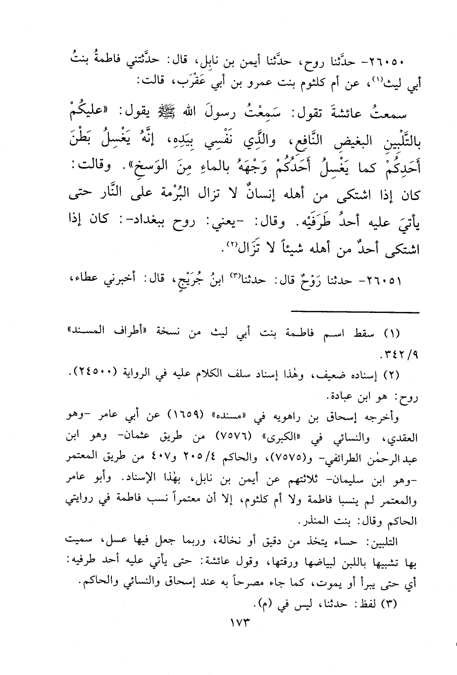 ٢٦٠٥٠ - حَدَّثَنَا رَوْحٌ، حَدَّثَنَا أَيْمَنُ بْنُ نَابِلٍ، قَالَ: حَدَّثَتْنِي فَاطِمَةُ بِنْتُ أَبِي لَيْثٍ، (١) عَنْ أُمِّ كُلْثُومٍ بِنْتِ عَمْرِو بْنِ أَبِي عَقْرَبٍ، قَالَتْ سَمِعْتُ عَائِشَةَ، تَقُولُ سَمِعْتُ رَسُولَ اللهِ صَلَّى اللهُ عَلَيْهِ وَسَلَّمَ يَقُولُ: " عَلَيْكُمْ بِالتَّلْبِينِ الْبَغِيضِ النَّافِعِ، وَالَّذِي نَفْسِي بِيَدِهِ، إِنَّهُ يَغْسِلُ بَطْنَ أَحَدِكُمْ كَمَا يَغْسِلُ أَحَدُكُمْ وَجْهَهُ بِالْمَاءِ مِنَ الْوَسَخِ، وَقَالَتْ كَانَ إِذَا اشْتَكَى مِنْ أَهْلِهِ إِنْسَانٌ لَا تَزَالُ الْبُرْمَةُ عَلَى النَّارِ، حَتَّى يَأْتِيَ عَلَيْهِ أَحَدُ طَرَفَيْهِ " وَقَالَ يَعْنِي رَوْحٌ بِبَغْدَادَ: كَانَ إِذَا اشْتَكَى أَحَدٌ مِنْ أَهْلِهِ شَيْئًا لَا تَزَالُ (٢)