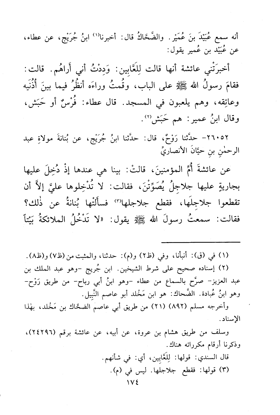 ٢٦٠٥٢ - حَدَّثَنَا رَوْحٌ، قَالَ: حَدَّثَنَا ابْنُ جُرَيْجٍ، عَنْ بُنَانَةَ، مَوْلَاةِ عَبْدِ الرَّحْمَنِ بْنِ حَيَّانَ الْأَنْصَارِيِّ عَنْ عَائِشَةَ أُمِّ الْمُؤْمِنِينَ، قَالَتْ: بَيْنَا هِيَ عِنْدَهَا إِذْ دُخِلَ عَلَيْهَا بِجَارِيَةٍ عَلَيْهَا جَلَاجِلُ يُصَوِّتْنَ فَقَالَتْ: لَا تُدْخِلُوهَا عَلَيَّ إِلَّا أَنْ تَقْطَعُوا جَلَاجِلَهَا فَقُطِعَ جَلَاجِلَهَا (٣) فَسَأَلَتْهَا بُنَانَةُ عَنْ ذَلِكَ فَقَالَتْ: سَمِعْتُ رَسُولَ اللهِ صَلَّى اللهُ عَلَيْهِ وَسَلَّمَ يَقُولُ: " لَا تَدْخُلُ الْمَلَائِكَةُ بَيْتًا