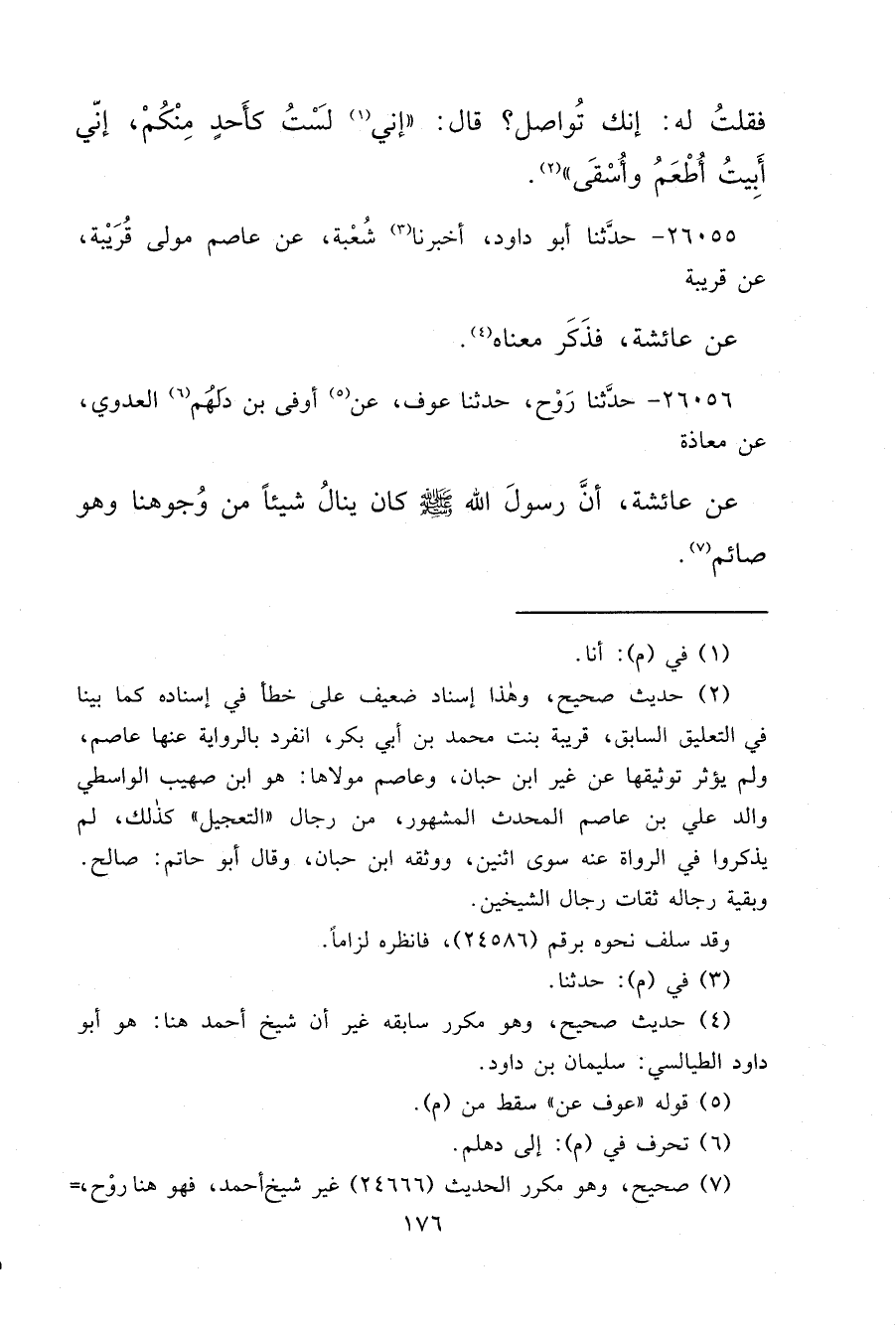 ٢٦٠٥٦ - حَدَّثَنَا رَوْحٌ، حَدَّثَنَا عَوْفٌ، عَنْ (٥) أَوْفَى بْنُ دَلْهَمٍ (٦) الْعَدَوِيُّ، عَنْ مُعَاذَةَ، عَنْ عَائِشَةَ، " أَنَّ رَسُولَ اللهِ صَلَّى اللهُ عَلَيْهِ وَسَلَّمَ، كَانَ يَنَالُ شَيْئًا مِنْ وُجُوهِنَا وَهُوَ صَائِمٌ " (٧)