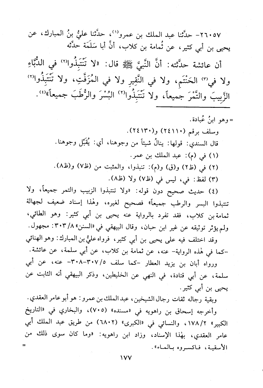 ٢٦٠٥٧ - حَدَّثَنَا عَبْدُ الْمَلِكِ بْنُ عَمْرٍو، (١) حَدَّثَنَا عَلِيُّ بْنُ الْمُبَارَكِ، عَنْ يَحْيَى بْنِ أَبِي كَثِيرٍ، عَنْ ثُمَامَةَ بْنِ كِلَابٍ، أَنَّ أَبَا سَلَمَةَ، حَدَّثَهُ أَنَّ عَائِشَةَ حَدَّثَتْهُ أَنَّ النَّبِيَّ صَلَّى اللهُ عَلَيْهِ وَسَلَّمَ، قَالَ: " لَا تَنْتَبِذُوا (٢) فِي الدُّبَّاءِ، وَلَا فِي (٣) الْحَنْتَمِ، وَلَا فِي النَّقِيرِ، وَلَا فِي الْمُزَفَّتِ، وَلَا تَنْتَبِذُوا (٢) الزَّبِيبَ وَالتَّمْرَ جَمِيعًا، وَلَا تَنْتَبِذُوا (٢) الْبُسْرَ وَالرُّطَبَ جَمِيعًا " (٤)