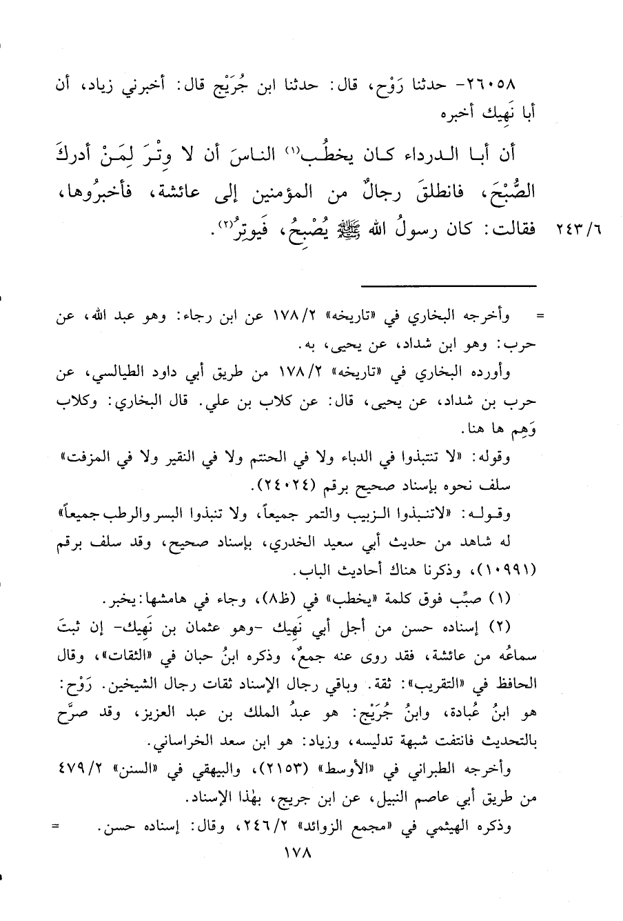 ٢٦٠٥٨ - حَدَّثَنَا رَوْحٌ، قَالَ: حَدَّثَنَا ابْنُ جُرَيْجٍ، قَالَ: أَخْبَرَنِي زِيَادٌ، أَنَّ أَبَا نَهِيكٍ، أَخْبَرَهُ أَنَّ أَبَا الدَّرْدَاءِ كَانَ يَخْطُبُ (١) النَّاسَ أَنْ لَا وَتْرَ لِمَنْ أَدْرَكَ الصُّبْحَ فَانْطَلَقَ رِجَالٌ مِنَ الْمُؤْمِنِينَ إِلَى عَائِشَةَ، فَأَخْبَرُوهَا، فَقَالَتْ: " كَانَ رَسُولُ اللهِ صَلَّى اللهُ عَلَيْهِ وَسَلَّمَ يُصْبِحُ، فَيُوتِرُ " (٢)